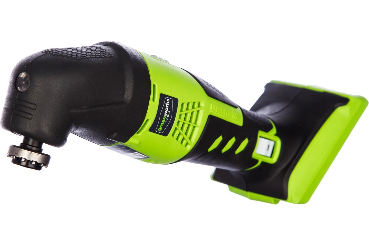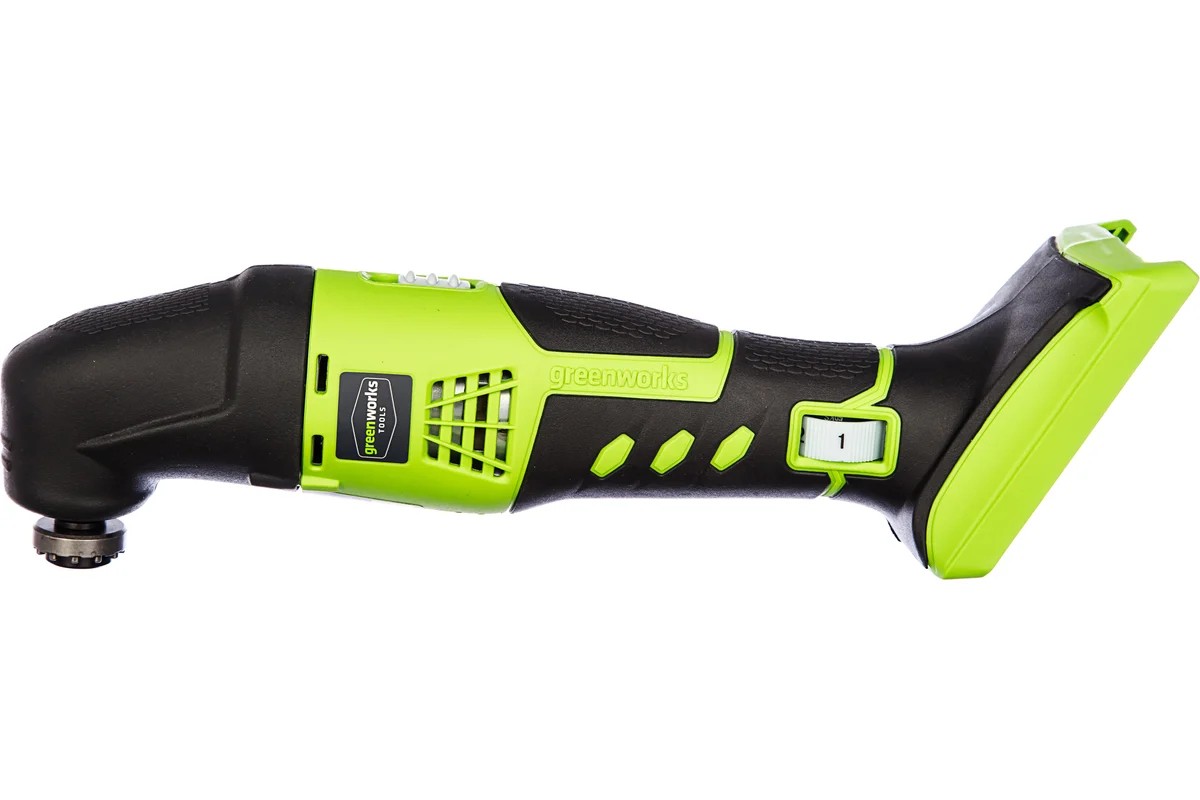 Регулировка частоты колебаний Светодиодная подсветка рабочей зоны Бесключевая замена оснастки Прорезиненная рукоятка Компактные размеры и малый вес Аккумуляторная линейка Greenworks 24V Функциональность |