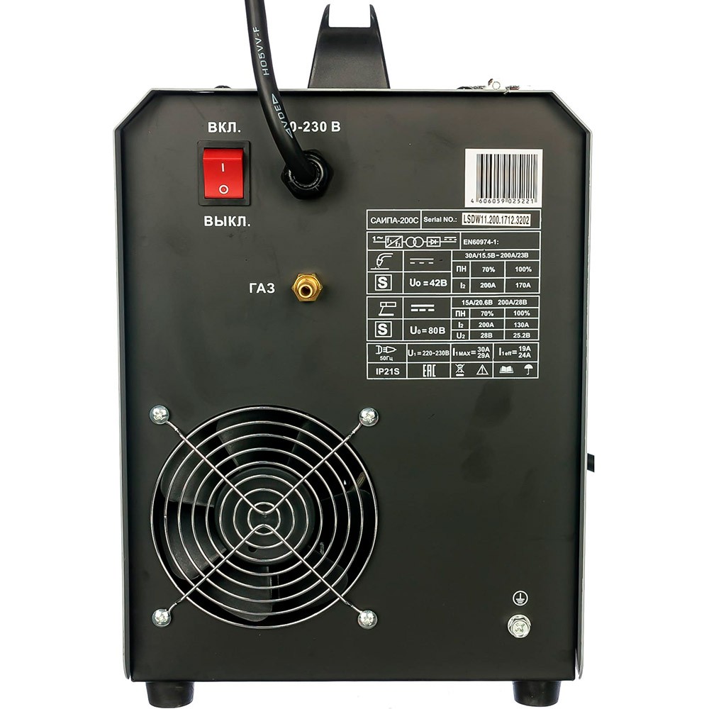 Класс защиты IP 21 Защита от перегрева и пониженного напряжения сети Несъемная горелка Дополнительно оборудована функция сварки ММА |