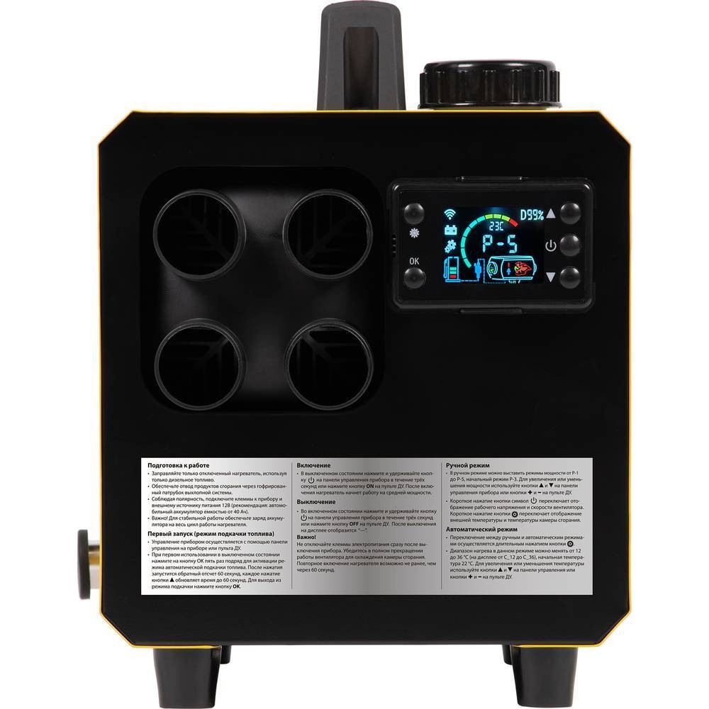Встроенный цифровой термостат повышенной чувствительности Термозащита 6 ступеней мощности Встроенный датчик уровня топлива Легкий запуск Компактный и удобный в LED дисплей Дистанционное управление с помощью пульта ДУ Самая полная комплектация Удобная рукоятка для перемещения |