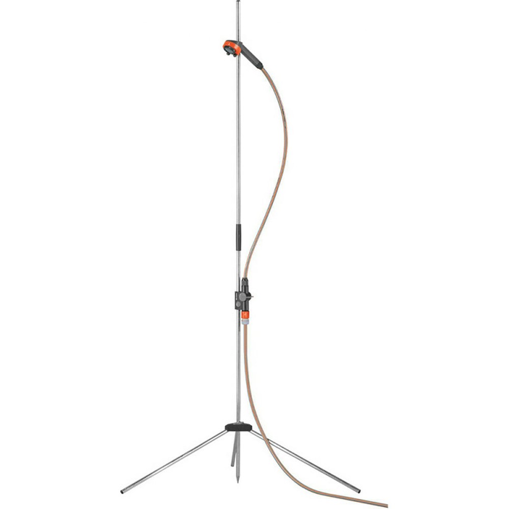 Душ садовый Gardena поставляется с алюминиевым штативом длиной 220см. Для работы душа необходимо просто подключить шланг уличного водопровода с напором, желательно, не менее 1Атм. Штатив устойчивый, центральная опора оборудована острым конусом, который надежно втыкается в землю. Боковую поддержку обеспечивает три ножки. Душевая насадка меняет вид струи, от обычного душа распылителя до мелкодисперсного распыления. Длина шланга душевой насадки 130см. Поворотный регулятор может менять напор воды, а также пологостью перекрывать проток.
