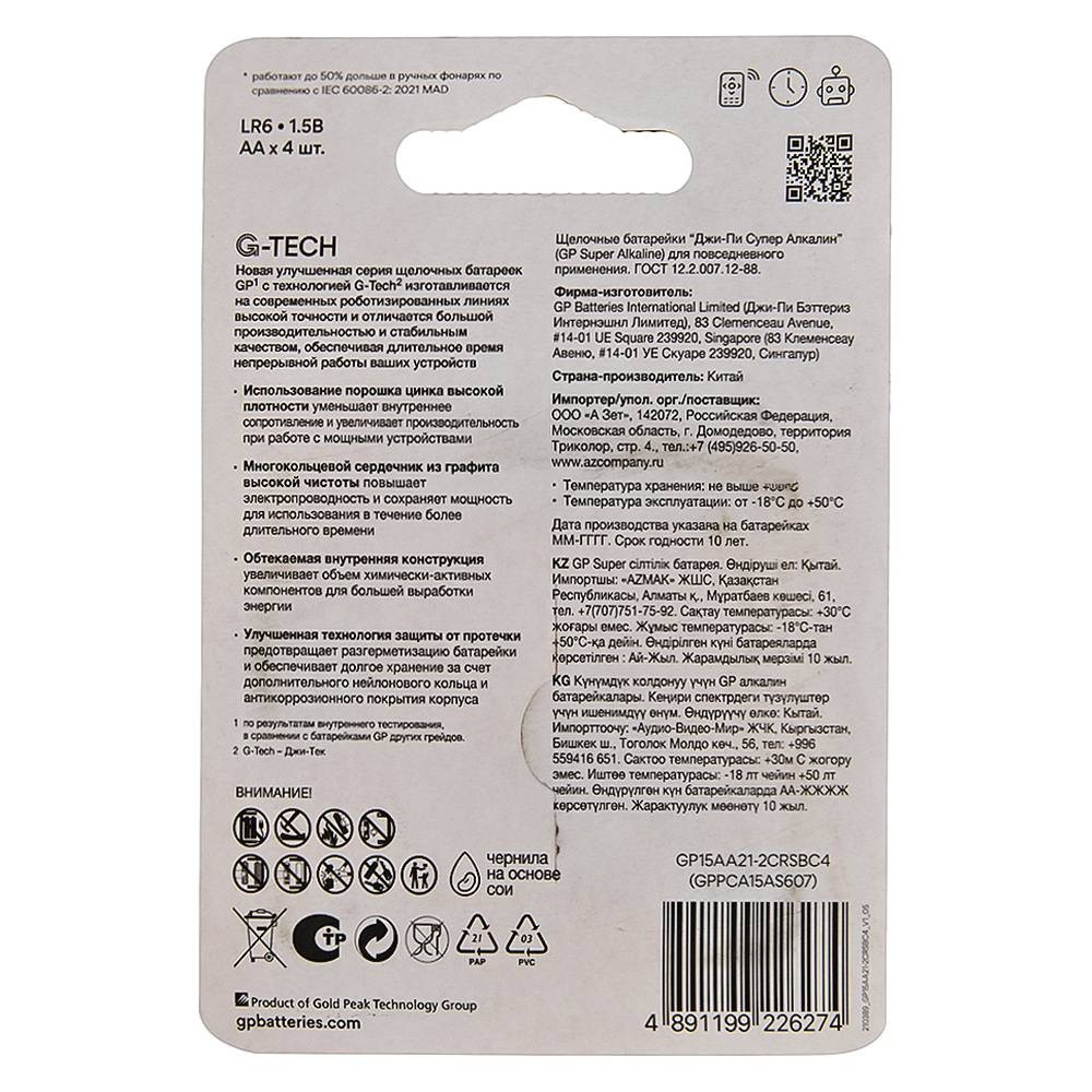 Элемент питания GP15 AA21-2CRSBC4 4шт - это новая улучшенная серия щелочных батареек GP с технологией G-Tech изготавливается на современных роботизированных линиях высокой точности и отличается большой производительностью и стабильным качеством, обеспечивая длительное время непрерывной работы Ваших устройств. Использование порошка цинка высокой плотности уменьшает внутреннее сопротивление и увеличивает производительность при работе с мощными устройствами. Многоцелевой сердечник из графита высокой чистоты повышает электропроводность и сохраняет мощность для использования в течение более длительного времени. Обтекаемая внутренняя конструкция увеличивает объем химически-активных компонентов для большей выработки энергии. Улучшенная технология защиты от протечки предотвращает разгерметизацию батарейки и обеспечивает долгое хранение за счёт дополнительного нейлонового кольца и антикоррозийного покрытия корпуса.