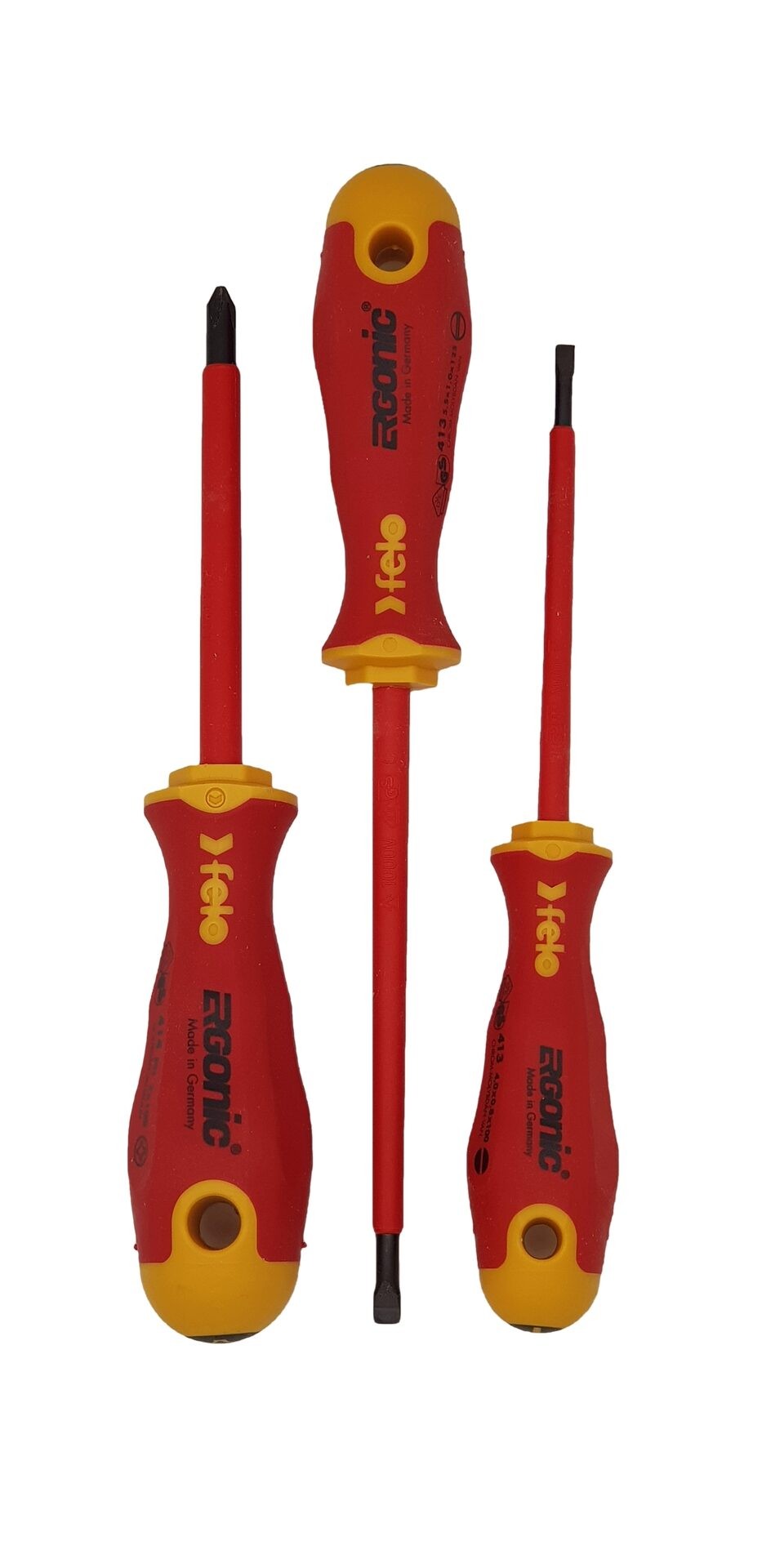 Набор диэлектрических отверток FELO ERGONIC из 3 предметов. ERGONIC - первая в мире рукоятка, адаптирующаяся под руку пользователя. Гладкая ручка без шва и эргономичная форма рукоятки позволяют комфортно работать. Дизайн рукоятки не позволяет инструменту скатываться с поверхности. Отверстие в рукоятке предназначено для передачи дополнительного усилия на инструмент и удобства его хранения. Для удобства пользователя на верхней части рукоятки указан тип шлица. Износостойкость диэлектрический отвёрток набора превышает технические требования DIN и ISO более, чем на 100 %. Состав набора: Отвертка SL 413 4,0x100 / 5,5x125 Отвертка PH 414 PH2x100