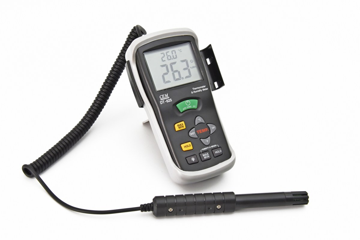 Термогигрометр CEM DT-625 — это компактное и современное цифровое устройство с микропроцессорным управлением, которое применяют для точного замера температуры воздуха в разбеге от -30 до +100°С и влажности от 0 до 100%. Кроме того, прибор может определять точку росы.