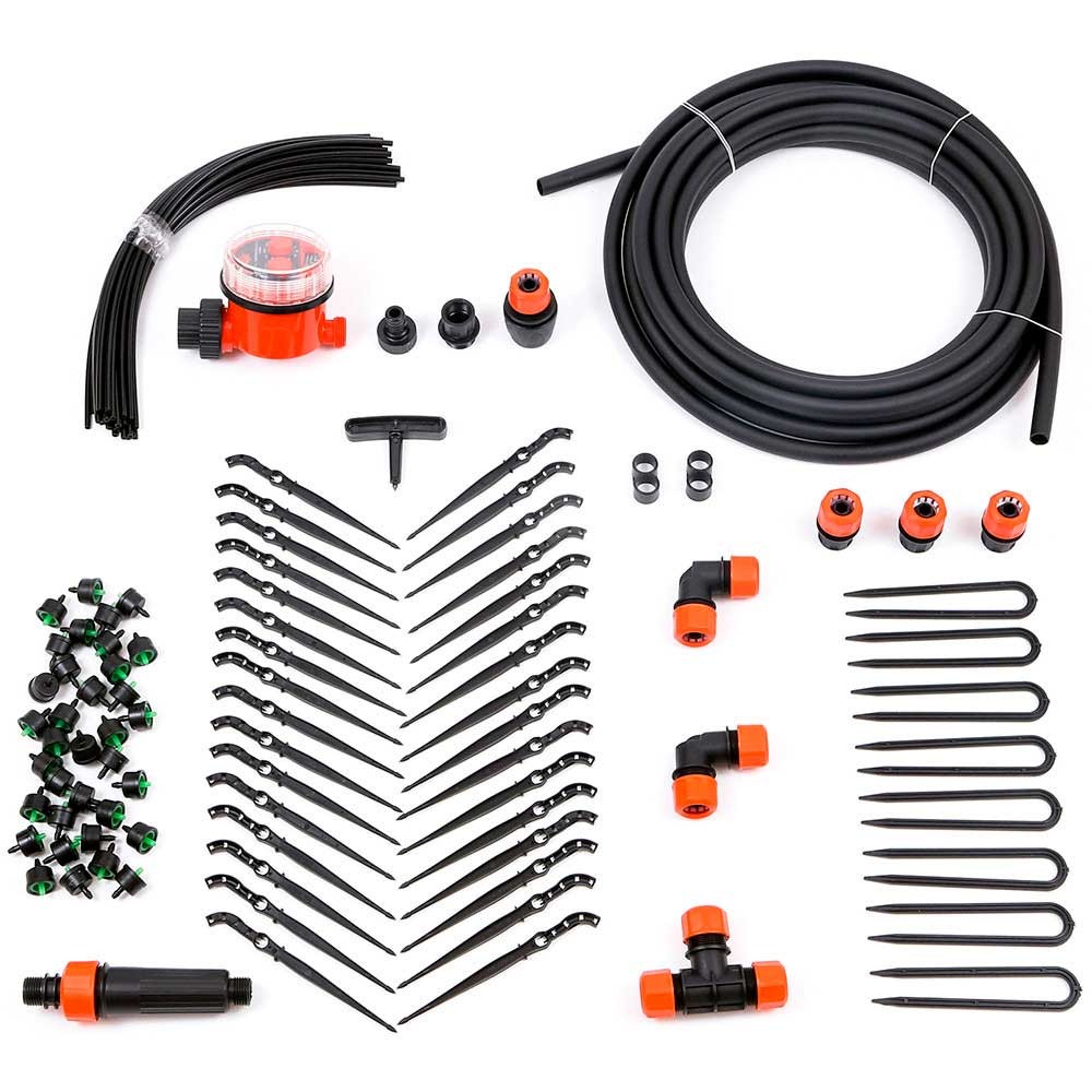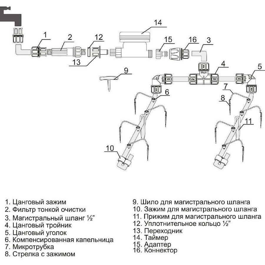 Электронный таймер для автоматического управления подачей воды в системе капельного полива Все шланги в комплекте выполнены из чёрного полиэтилена, что предотвращает зацветание воды в полостях шлангов В комплект входят компенсированные капельницы Dr.Drop |