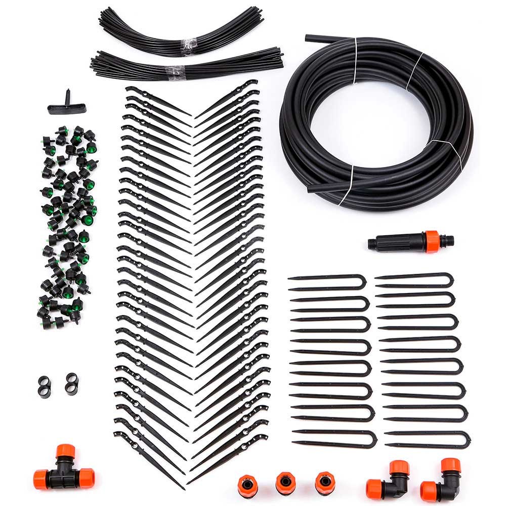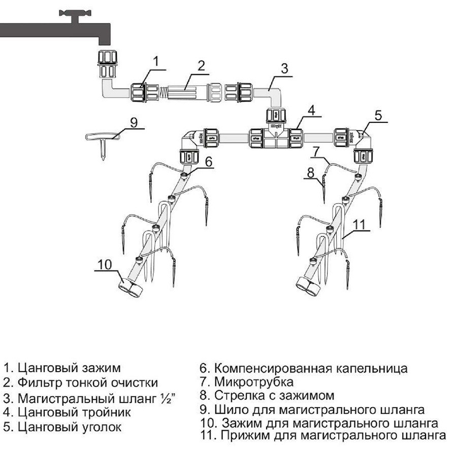 Все шланги в комплекте выполнены из чёрного полиэтилена, что предотвращает зацветание воды в полостях шлангов В комплект для капельного полива Жук от водопровода входят компенсированные капельницы Dr.Drop- позволяют выдерживать любое давление в системе, что очень важно при подключении к водопроводу Цанговые зажимы, уголки и тройники в системе, обеспечивают надежность соединений и предотвращают заломы магистрального шланга при поворотах на 90 градусов Зажимы магистрального шланга, входящие в комплект, дают возможность устанавливать капельный полив Жук сразу на несколько грядок Фильтр тонкой очистки воды, для того, чтобы не засорить шланги и капельницы капельного полива в процессе эксплуатации Для монтажа компенсированных капельниц к магистральному шлангу, в комплекте предусмотрено шило |