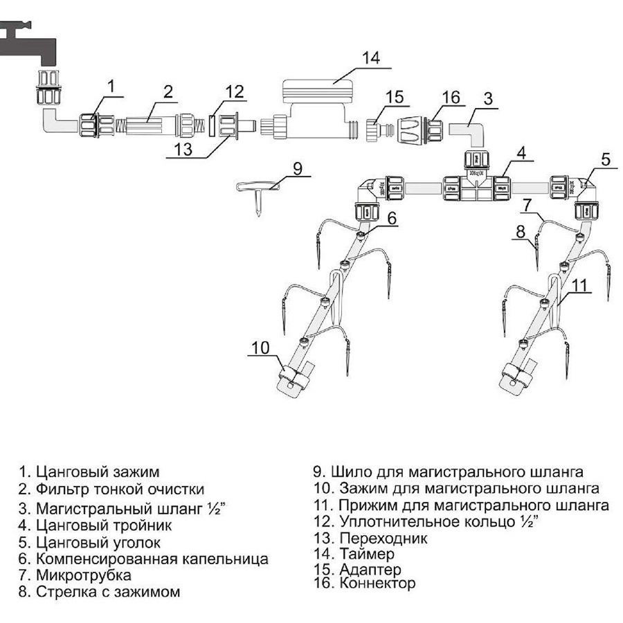 Капельный полив ЖУК от водопровода 60 растений с таймером