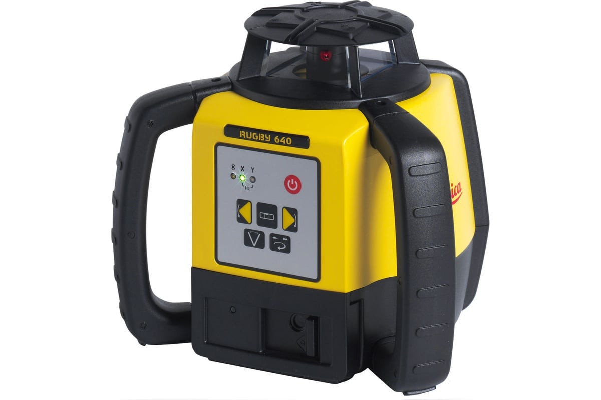 Кроме традиционного режима проекции горизонтальной лазерной плоскости, относительно которой выполняются измерения или разметка, ротационный нивелир Leica Rugby 640 также используется и для построения вертикали. Система самовыравнивания данного прибора способна работать в двух положениях, а на корпусе нивелира имеются два крепежных узла — внизу и сбоку, для крепления его на штативе.