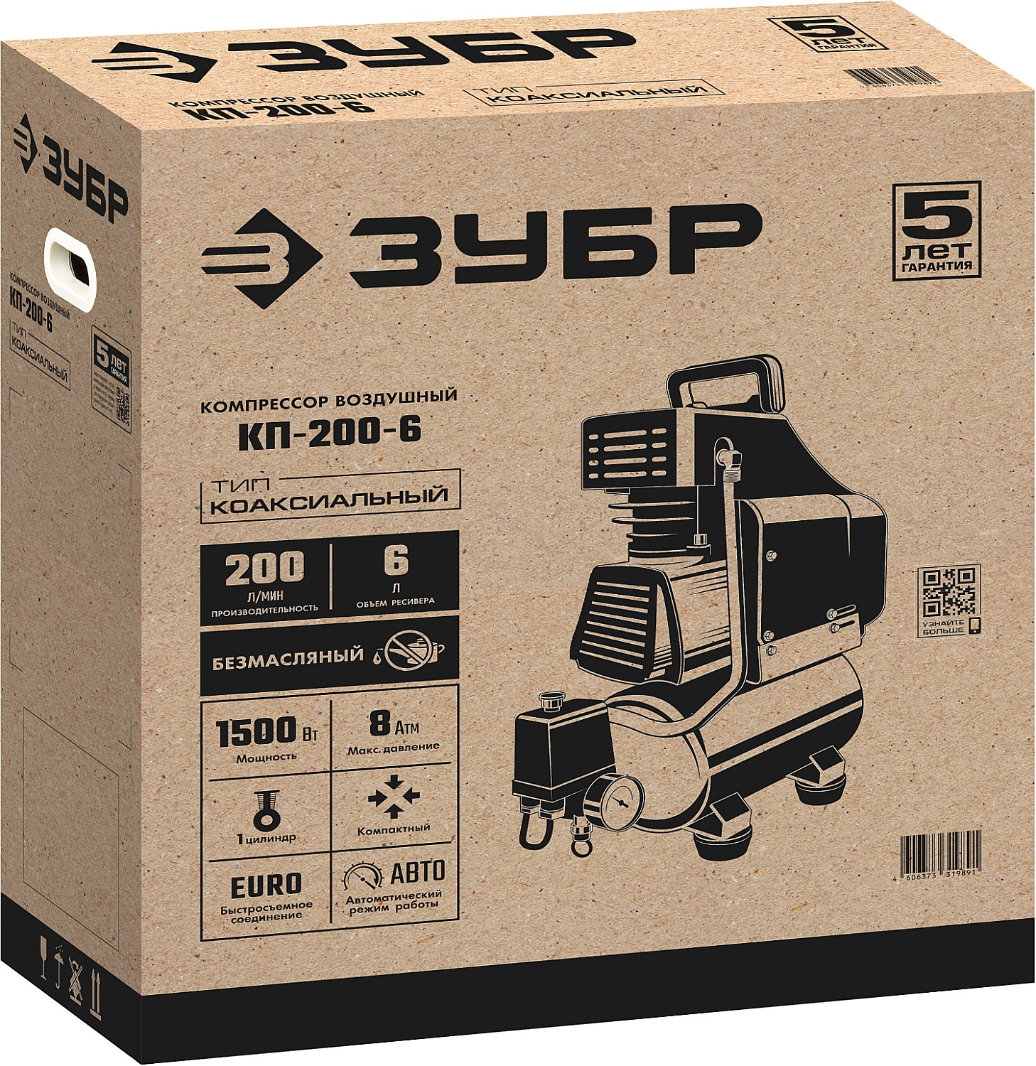 <div class="catalog-product-attributes__white-gradient"></div> Безмасляный воздушный компрессор ЗУБР КП-200-6 (200 л/мин, 1500 Вт) обеспечивает чистый сжатый воздух без масляных примесей для покраски, подкачки шин и очистки техники. Прочный компактный корпус и ресурс до 1000 часов делают его надежным помощником в домашнем ремонте, на даче и в небольшой мастерской. Мобильный, долговечный и универсальный — идеален для бытовых задач, где важны чистота воздуха и простота эксплуатации. |