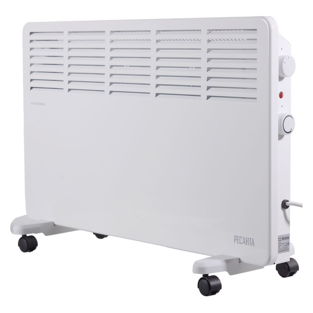 Конвектор Ресанта ОК-2000 подходит для обогрева помещений, включая жилые, размером до 25м2. Используемый нагревательный элемент – монолитный Х-образный, отличается большой площадью теплоотдачи. При этом потребляемая мощность составляет 1000/2000Вт. Компактный и лёгкий конвектор экономично расходует электроэнергию, но при этом способен быстро нагреть воздух в помещении до нужной температуры. Электроконвектор работает без вентилятора, за счет конвекционного переноса тепла и естественной циркуляции. Прибор оснащён высокоточным управляемым термостатом. Он быстро выходит на режим и чётко поддерживает заданную температуру. Работает обогреватель бесшумно, не пересушивая воздух. Для удобства использования он оснащен колесами, но может монтироваться на стену.