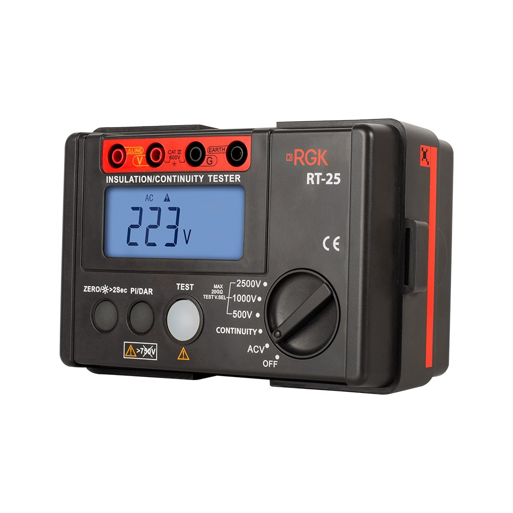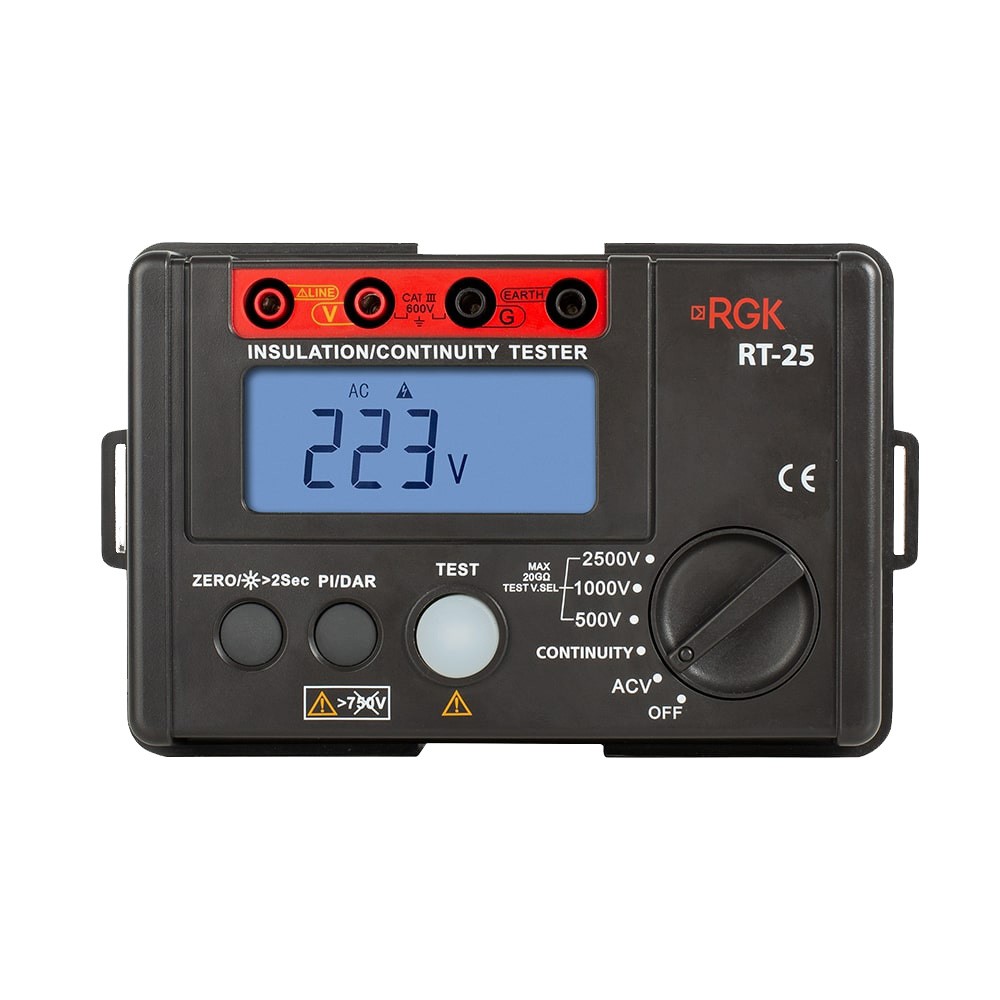 <div class="catalog-product-attributes__white-gradient"></div> Цифровой мегаомметр RGK RT-25 используется для оценки качества изоляции при проведении диагностики и ремонта электронного оборудования, элементов энергосистем, трансформаторов, электродвигателей. Этот прибор гораздо точнее, чем мультиметр может локализовать участки изоляции, утратившие свои первоначальный свойства, или механические повреждения и определить масштаб проблемы. Проверки неразрушающим методом не требуют долгой приостановки работы объекта и нарушения целостности проводников. Принцип работы измерителя сопротивления изоляции RGK RT-25 заключается в генерации и подаче напряжения на предмет исследования. По итогу определяется утечка тока и значение сопротивления между 2 щупами или зажимами. Функционал устройства дополнен режимом вольтметра, что упрощает комплексные проверки электрооборудования. Источник питания 6 батарей АА 1,5 В. |