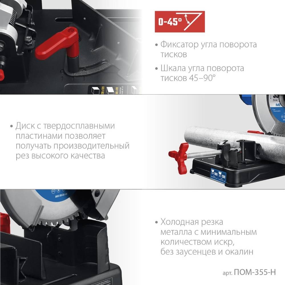 Высокая скорость и точность реза Мощный электродвигатель и усиленный Редуктор обеспечивают непрерывный режим работы S1 Высокая производительность, качество и точность реза Холодная резка металла с минимальным количеством искр Быстрая и надежная фиксация заготовки Простая замена угольных щеток Прочное штампованное основание Резиновые опоры для снижения вибраций Лазерный указатель |