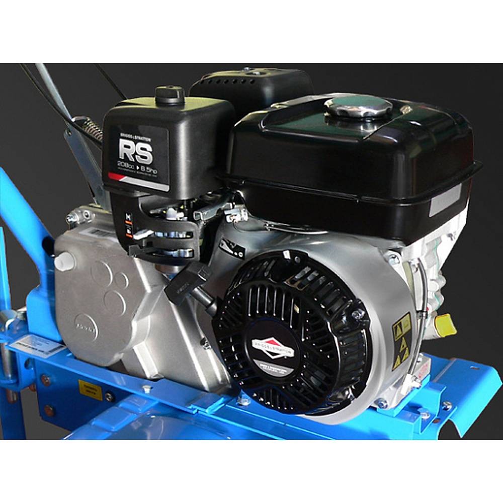 Редуктор с высоким тяговым усилием Двигатель с высоким ресурсом Функция разобщения колес Возможность работы с 8 фрезами Пахотная скорость — до 2 км/ч Транспортная скорость — до 12,5 км/ч |