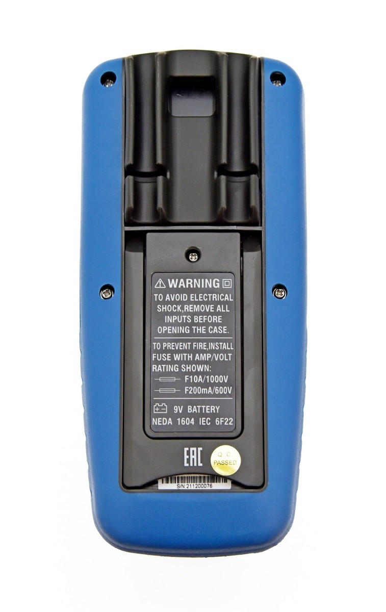 Постоянное напряжение Пределы измерений 600 мВ 6, 60, 600, 1000 В Погрешность ± (0.09 % + 2 е.м.р.) Макс. разрешение 0.1 мВ Вх. сопротивление 7.8 МОм Защита входа 1000 В Переменное напряжение Пределы измерений 600 мВ 6, 60, 600, 1000 В Погрешность ± (0.8 % ± 3 е.м.р.) Макс. разрешение 0.1 мВ Полоса частот 50 – 400 Гц Вх. сопротивление 7.8 МОм Защита входа 1000 В Постоянный ток Пределы измерений 600 мкА 6, 60, 600 мА 10 А Погрешность ± (1 % ± 3 е.м.р.) Макс. разрешение 0.01 мкА Защита входа Предохранитель 0.5 А/1000 В (вход «мА») 10 А/1000 В (вход «А») Переменный ток Пределы измерений 600 мкА 6, 60, 600 мА 10 А Погрешность ± (1.5 % ± 5 е.м.р.) Макс. разрешение 0.01 мкА Полоса частот 50 – 400 Гц Защита входа Предохранитель 0.5 А/1000 В (вход «мА») 10 А/1000 В (вход «А») Сопротивление Пределы измерений 600 Ом 6, 60, 600 кОм 6, 60 МОм Погрешность ± (0.3 % ± 4 е.м.р.) Макс. разрешение 1 пФ Защита входа 1000 В Ёмкость Пределы измерений до 40мФ Погрешность ± (3 % ± 5 е.м.р.) Макс. разрешение 1 пФ Защита входа 600 В Частота Пределы измерений 10, 100, 1000 Гц 10, 100, 1000 кГц 10 МГц Погрешность ± (0.1 % + 1 е.м.р.) Макс. разрешение 0.001 Гц Защита входа 600 В Коэффициент заполнения импульсов Диапазон измерений 0.1 – 99.9 % Погрешность ± (1.2 % ± 2 е.м.р.) Макс. разрешение 0.1 % Защита входа 600 В Температура Диапазон измерений -20°С ~ 760°С Погрешность ± (3 % ± 3 е.м.р.) Макс. разрешение 1°С Защита входа 600 В Испытание P-N Макс. ток теста 0.3 мА Напряжение теста 1 мВ Защита входа 600 В Прозвон цепи Порог срабатывания < 150 Ом Тестовый ток < 0.3 мА Защита входа 600 В Общие данные Измерение с.к.в значений сигнал произвольной формы Пиковый детектор сигнал длительностью > 1 мс Макс. индицируемое число 11000 Дисплей Жидкокристаллический 21 мм с подсветкой Скорость измерения 2 в секунду Автовыключение через 30 минут Источник питания 9 В тип «Крона» Условия эксплуатации 0°С ~ 50°С отн. влажность: не более 70 % Условия хранения -20°С ~ 60°С отн. влажность: не более 80 % Габаритные размеры 182 х 82 х 55 мм Масса 360 г