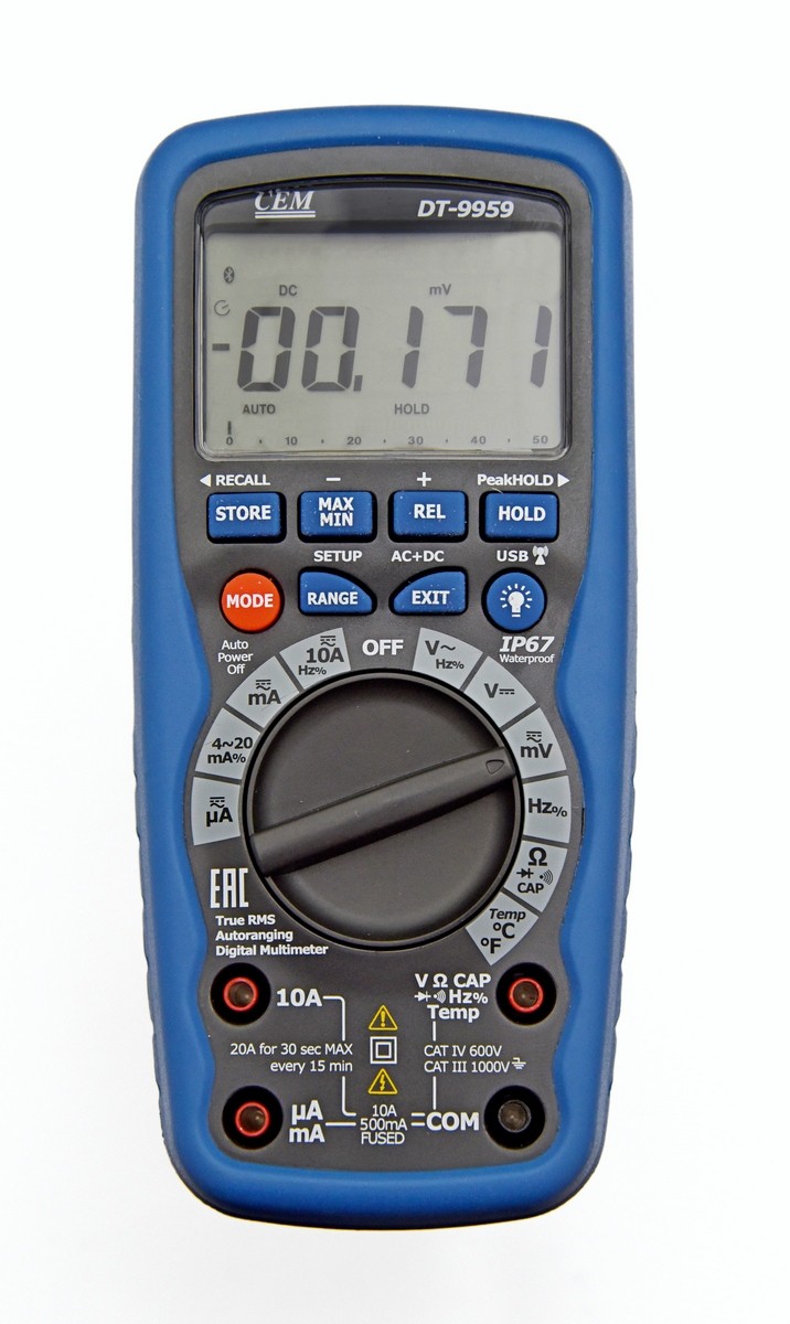 DT-9959 измеряет переменное и постоянное напряжение, переменный и постоянный ток, сопротивление, емкость, частоту (электрическую и электронную), коэффициент заполнения, выполняет контроль исправности диодов, проверку цепи на отсутствие обрыва, измерение температуры с помощью датчика-термопары. Прибор способен записывать и воспроизводить записанные данные на экран, имеет прочный корпус с защитой от проникновения влаги, предназначен для профессионального использования. Мультиметр может передавать данные по беспроводному каналу связи на ПК.