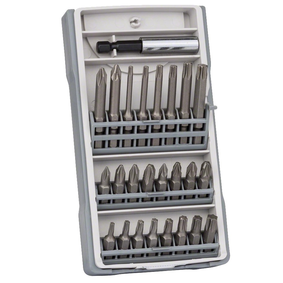 Набор бит Bosch 25шт (037) содержит разные длины и типы бит для разных типов шурупов и поставляется в практичной коробке с легким обзором содержимого. Внешний шестигранный хвостовик 1/4 дюйма для универсального применения с дрелями-шуруповертами и шуруповертами. Комплект состоит из 25 предметов: биты длиной 25 мм: PH1, 2 х PH2, PH3, PZ1, 2 х PZ2, PZ3, T10, T15, 2 х T20, T25, T27, T30, T40; биты длиной 49 мм: PH2, PZ2, T10, T15, T20, T25, T30, T40; держатель бит.