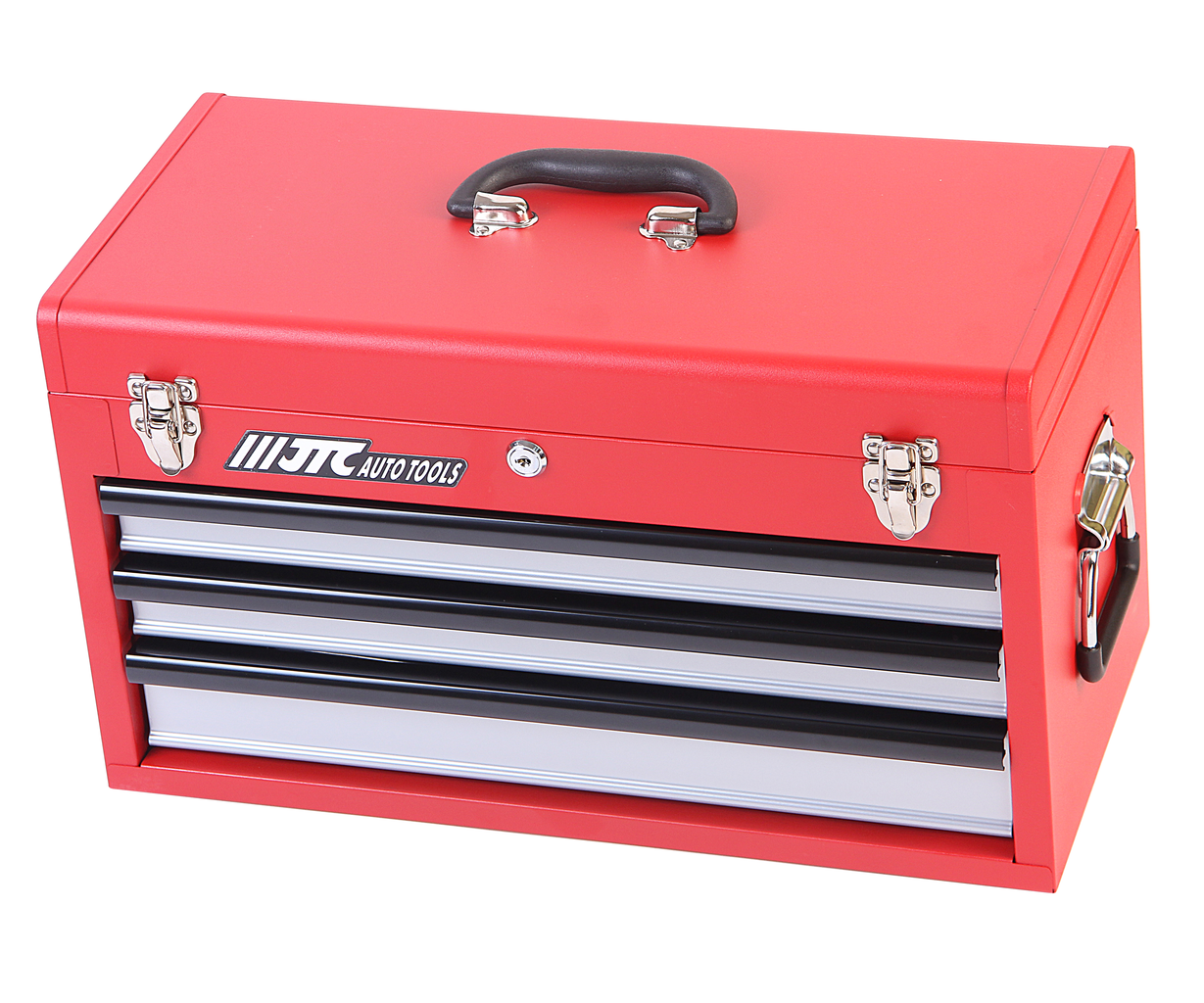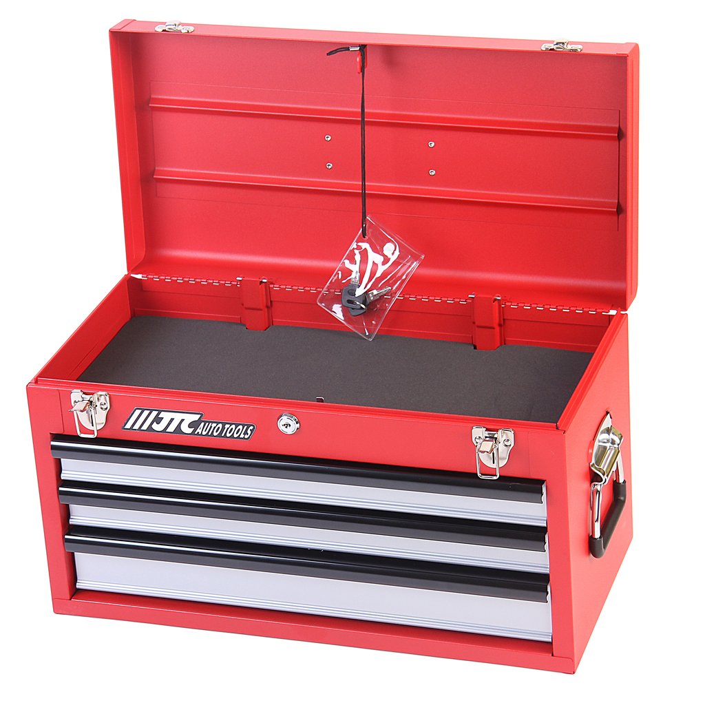 Инструментальный ящик JTC-B066. Материал - сталь. В набор входит 66 предметов на 3 выдвижных ложементах JTC-B066-1, B066-2, B066-3. Дополнительный отсек под крышкой для хранения бит, гаек, шпилек и т.д. В набор входят молоток, струбцина, отвертки разных размеров (38-150 мм), трещотка (посадочный квадрат 3/8"), биты, головки 8-22, магнитный свечной ключ 14, 16, 21.