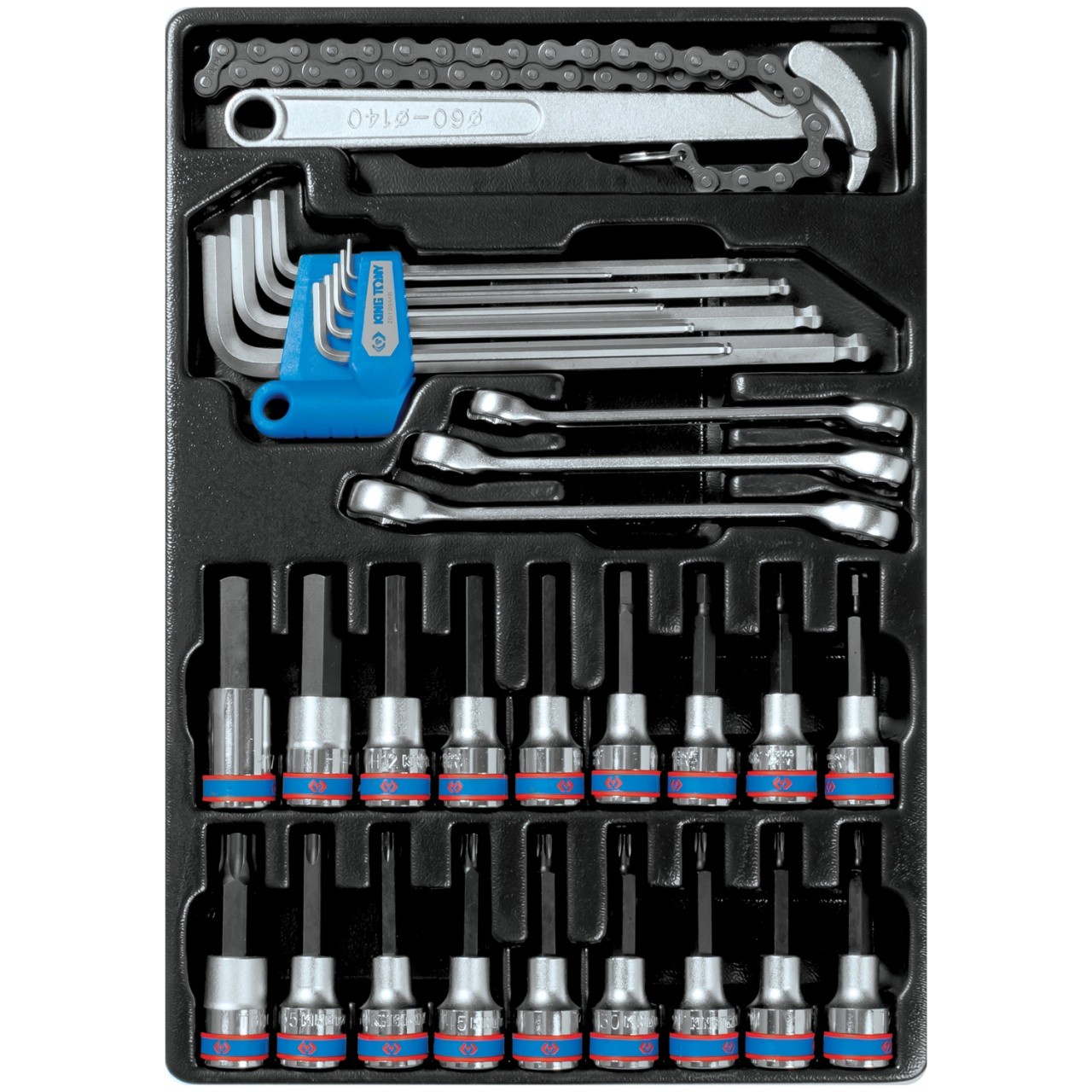 <div class="catalog-product-attributes__white-gradient"></div> Комплектация* • Инструмент и оснастка Съемник масляных фильтров цепной (3204) – 60-140 мм Набор HEX L-типа с шаром (20109MR) – H1.5, H2, H2.5, H3, H4, H5, H6, H8, H10 Ключи разрезные (1930) – 10x11, 12x14, 14x17 мм • Насадки торцевые 1/2" L=80 TORX (4033) – T20, T25, T27, T30, T40, T45, T50, T55, T60 HEX (4035) – H4, H5, H6, H7, H8, H10, H12, H14, H17 • Ложемент PVC 265x375 мм, №4 Технические характеристики Количество предметов – 31 Стандарт качества – DIN ISO 2936, DIN 3118, DIN 3120 Материалы – инструментальные стали Cr-V, SNCM+V (S2), хром, конструкционная сталь, пластик PP, PVC (ложемент) Упаковка – картонный короб Размеры в упаковке – 385x275x40 мм Вес – 3,22 кг Входит в комплектацию наборов BASTION, UNION. Эргономика Размер ложемента адаптирован для размещения на полке инструментальной тележки. Материал ложемента – PVC – термопластичный полимер черного цвета. Отличается химической стойкостью к щелочам, минеральным маслам, многим кислотам и р |