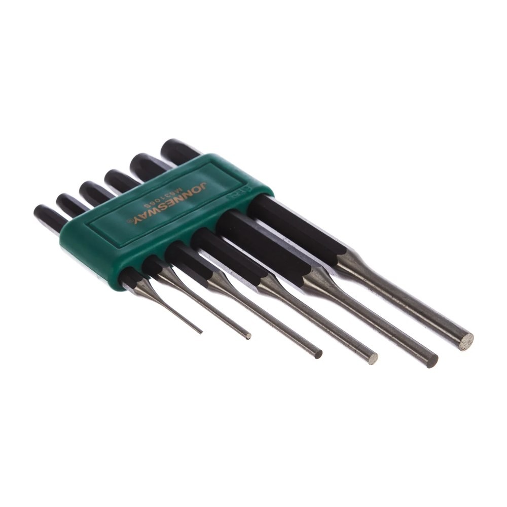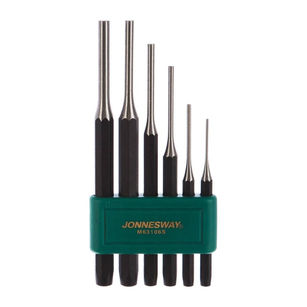 Набор выколоток Jonnesway 6шт M63106S применяется для ударных работ при различных слесарных, столярных и монтажных операциях с различным крепежом. Приспособления, входящие в набор, выполнены из высокопрочного материала, специально предназначенного для длительных ударных нагрузок, благодаря чему инструмент обеспечивает эффективную работу там, где заканчиваются физические возможности человека. Использование набора при ударных работах гарантирует безопасность как оператора, так и сохранность инструмента, на который направлен удар. Все это отвечает за производительность набора с выколотками и самое главное - снижение травматичности при данном виде работ. Набор включает в себя пластиковый держатель и 6 выколоток размерами: 2х8х115 мм; 3х8х125 мм; 4х9.5х150 мм; 5х9.5х165 мм; 6х12.7х180 мм; 8х12.7х180 мм.