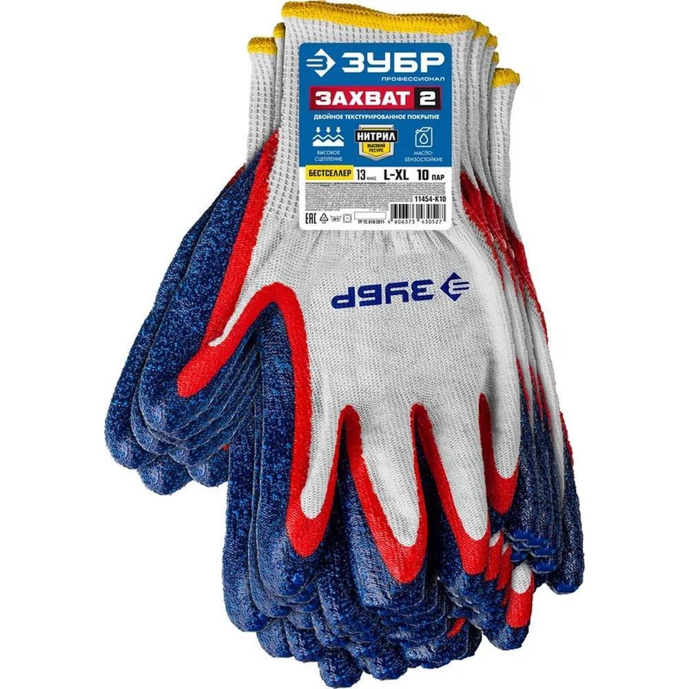 Перчатки ЗУбР ЗАХВАТ-2 х/б с двойным текстурированным нитриловым обливом L-XL 10пар 11454-K10