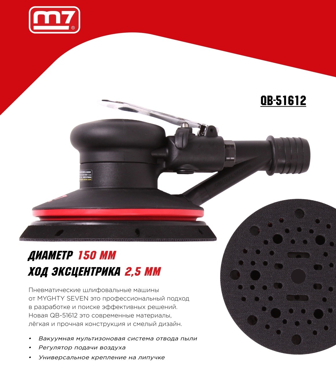Пневматическая орбитальная шлифовальная машина 150 мм, 12000 об/мин MIGHTY SEVEN QB-51612