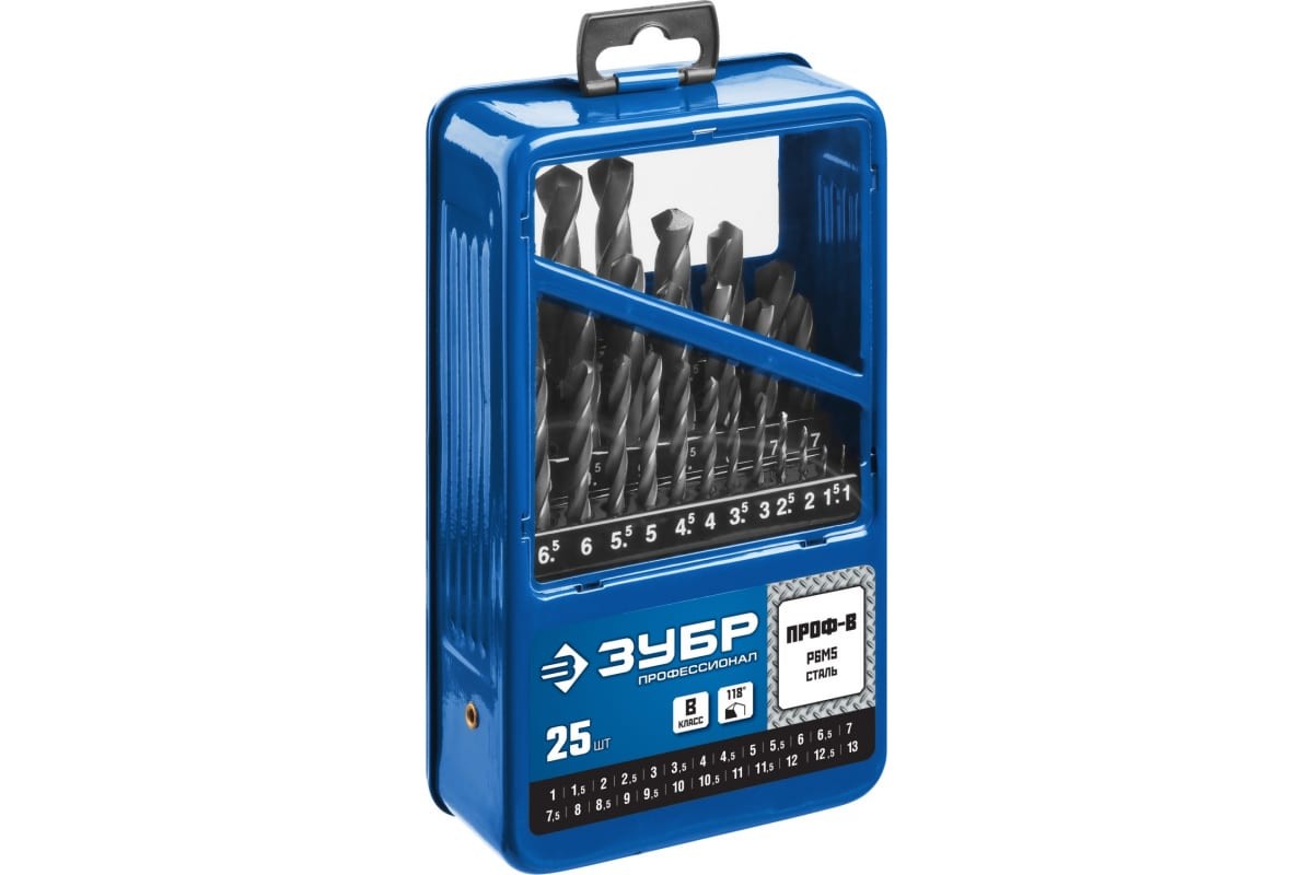 ПРОФ-В, 25 шт, (1-13 мм), сталь Р6М5, класс В, мет.бокс, набор сверл по металлу, Профессионал (29621-H25)