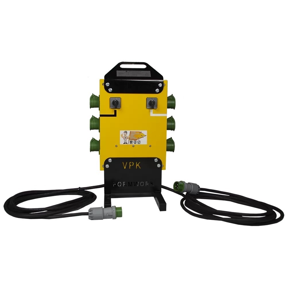 Разветвитель VPK Formwork 2/6 предназначен для подключения до 6-ти внешних вибраторов. Представляет собой коммутационное устройство с возможностью работы как от 1-ого преобразователя частоты, так и одновременно от 2-х независимых преобразователей. Для этого на входе имеются два кабеля с вилками 42В и 200 Гц. Минимальный ток каждой линии должен составлять 20 А. Каждый из двух кабелей питает группу розеток (3 шт) через переключатель для подключения шести внешних вибраторов.