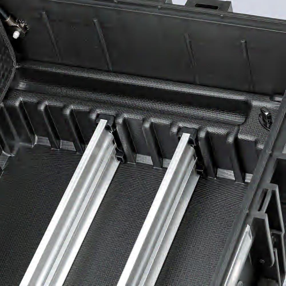 Ударопрочный корпус Пылеводонепроницаемость Клапан автоматического выравнивания давления Выдерживает температуру от-30°C до+80°C Приспособление для навесного замка 54 кармана и 94 крепёжных петли Специальное отделение для документов Алюминиевые разделители Колеса и выдвижная ручка Грузоподъемность до 35кг |