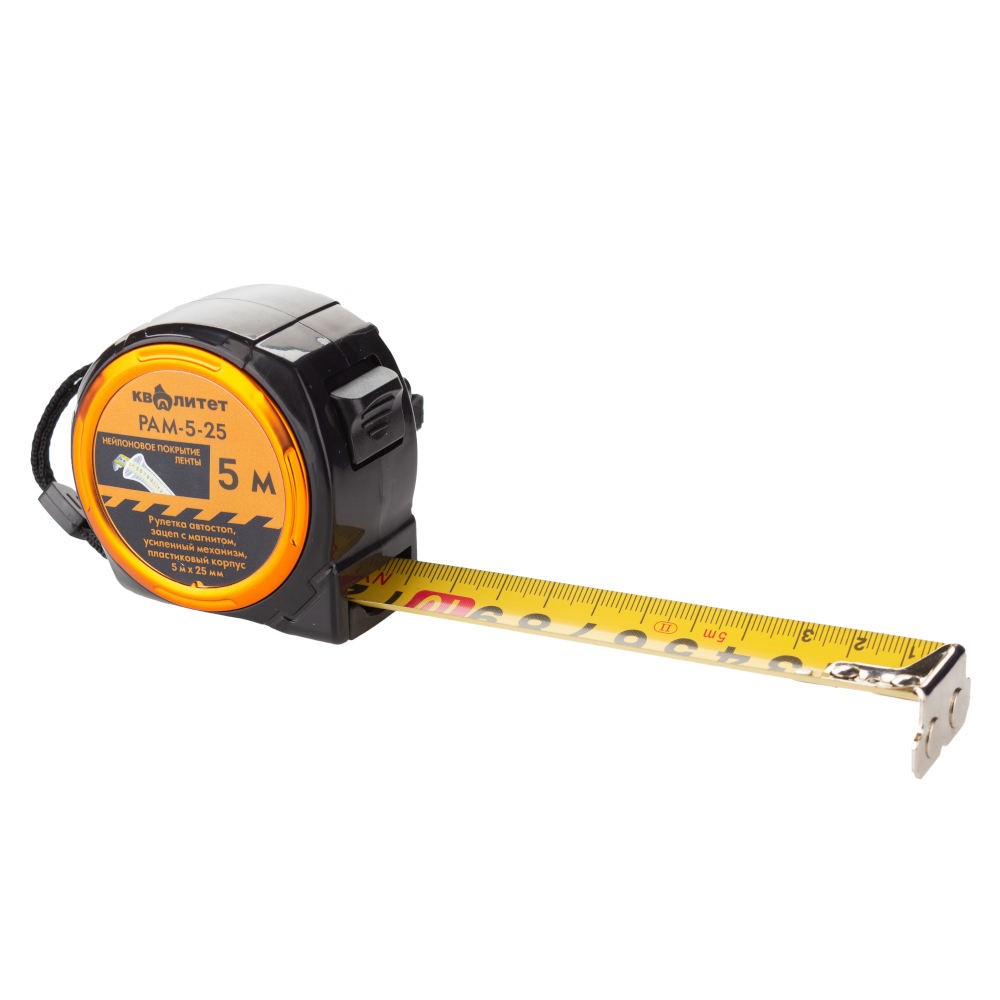 <div class="catalog-product-attributes__white-gradient"></div> <p class="product-page__description-paragraph"> Рулетка измерительная Квалитет с фиксатором магнитная 5м х 25мм РАМ-5-25 предназначена для определения размеров и расстояний. Корпус из ударопрочного пластика устойчив к повреждениям. Рулетка пригодится на строительной площадке, во время ремонта, а также дома или на даче.</p> <br> <ul class="catalog-product__features-list ul-list"> <li class="catalog-product__features-item">Компактные размеры - обеспечивают удобство эксплуатации</li> <li class="catalog-product__features-item">Фиксатор - облегчает проведение измерений</li> <li class="catalog-product__features-item">Усиленный механизм - увеличивает рабочий ресурс</li> <li class="catalog-product__features-item">Автостоп - автоматически фиксирует ленту в вытянутом положении</li> <li class="catalog-product__features-item">Магнитный зацеп - для надежного крепления ленты на металлической поверхности и упрощения замеров</li> <li class="catalog-produ |