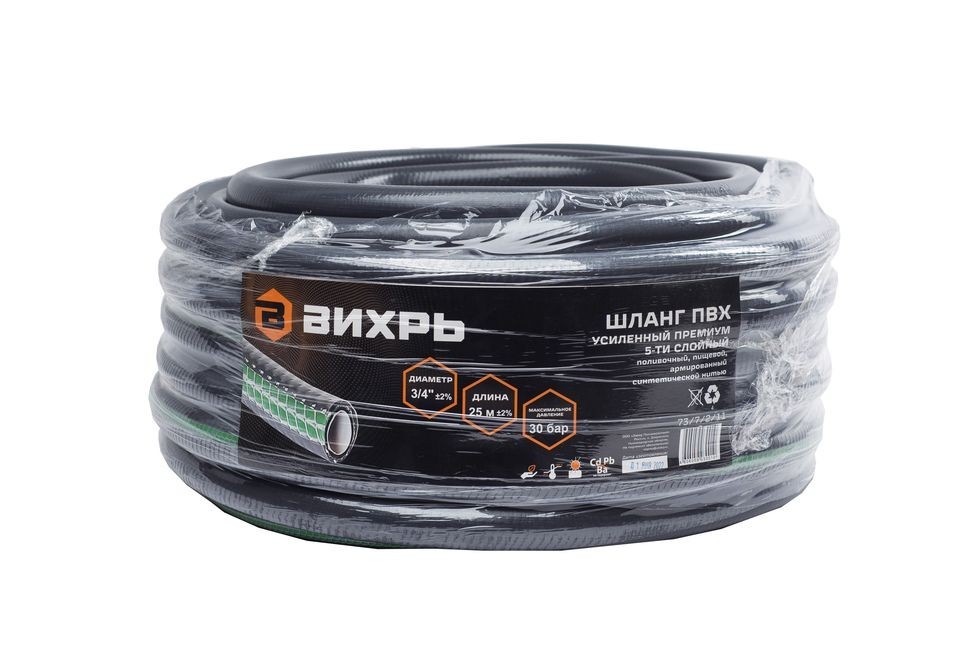 Шланг поливочный ПВХ усиленный премиум, пищевой пятислойный армированный 3/4, 25м (серый) Вихрь