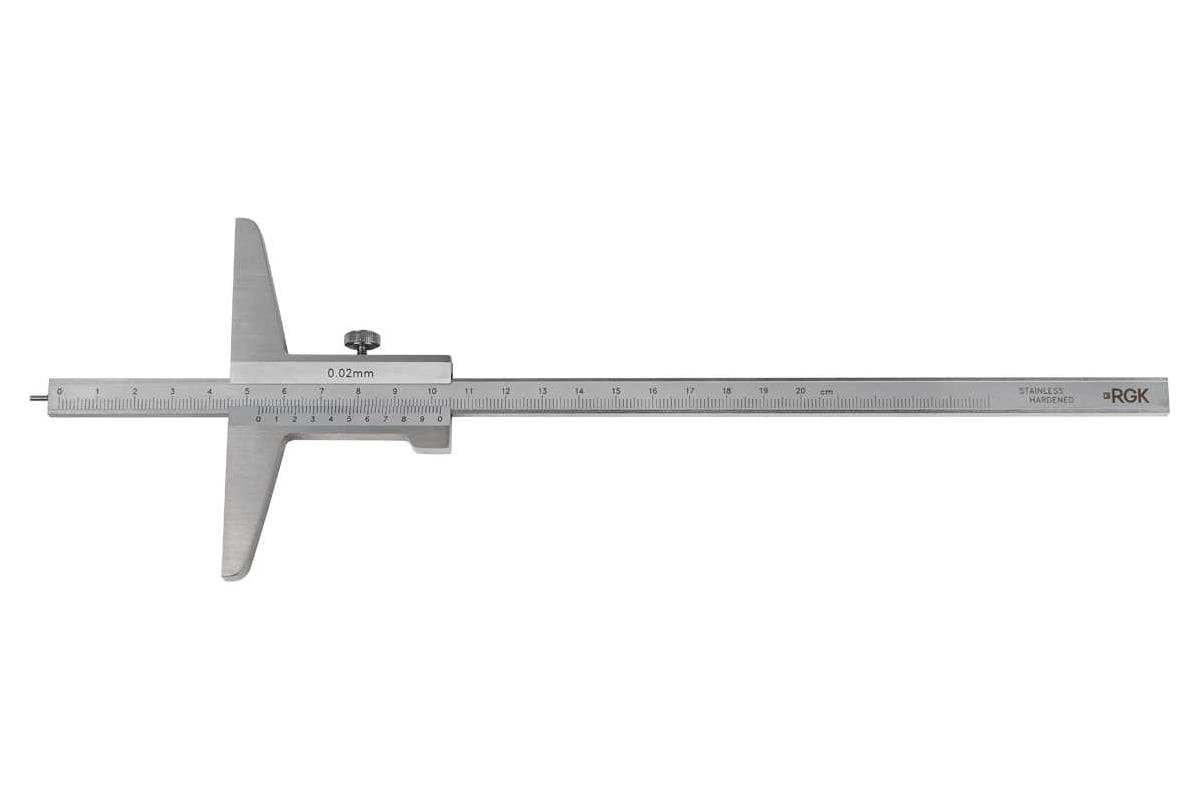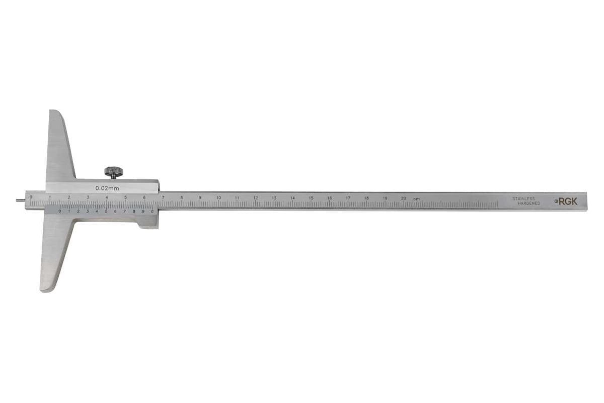 Штангенглубиномер RGK SCGM-200, рабочий диапазон которого составляет 0 -200 мм, снабжен нониусной шкалой на 50 делений, обеспечивая разрешение показаний в 0,02 мм при погрешности не более ±0,03 мм. Как инструмент механического типа, без сложных шестеренчатых и электронных компонентов, он характеризуется доступной ценой и высокой надежностью. Для выполнения измерений в небольших пазах, канавках и малоразмерных отверстиях штанга устройства оснащена тонким цилиндрическим наконечником диаметром 1,5 мм и длиной 5 мм.