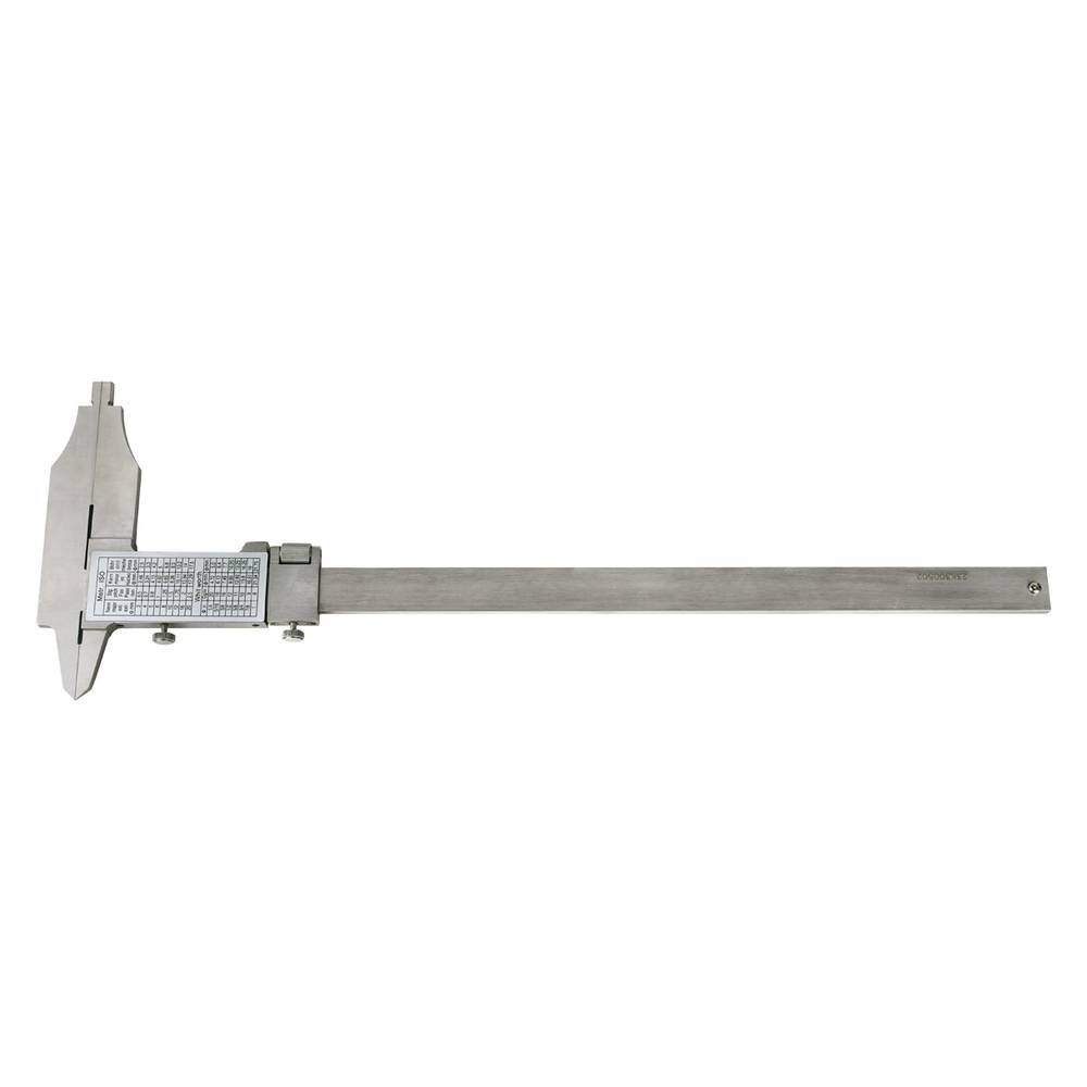 Верхние губки с кромочными измерительными поверхностями выполнены в заостренной форме, что упрощает выполнение замеров в труднодоступных местах. За счет увеличенной длины нижних губок штангенциркуль удобно использовать для измерения диаметра крупноразмерных цилиндрических изделий. Их плоская внутренняя часть позволяет точнее определять размеры деталей с наружной резьбой, а внешняя скругленная форма дает возможность контролировать диаметр отверстий и ширину пазов. С обратной стороны инструмента размещена таблица со справочными данными соответствия метрической и дюймовой резьбы разного размера диаметрам сверла.