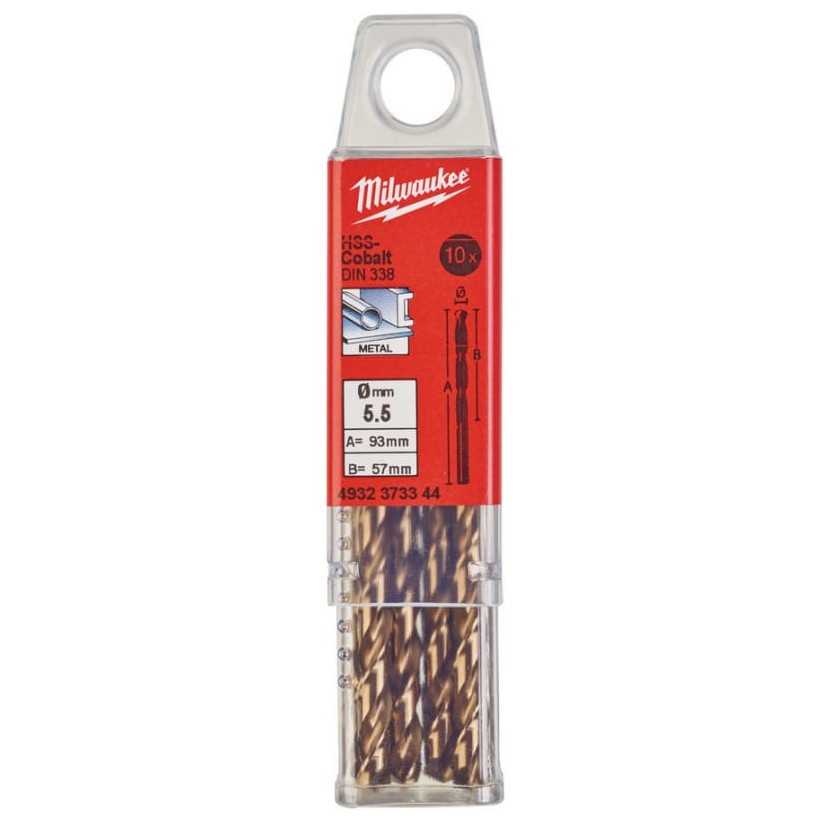 Сверло по металлу Milwaukee HSS-CO 5,5x93мм 10шт (344) из прочной и устойчивой к нагреву быстрорежущей стали с 5% добавлением кобальта. Применяется для сверления высоколегированных сталей и металлов с пределом прочности на разрыв свыше 1000 Н/мм2, например, нержавеющая сталь.