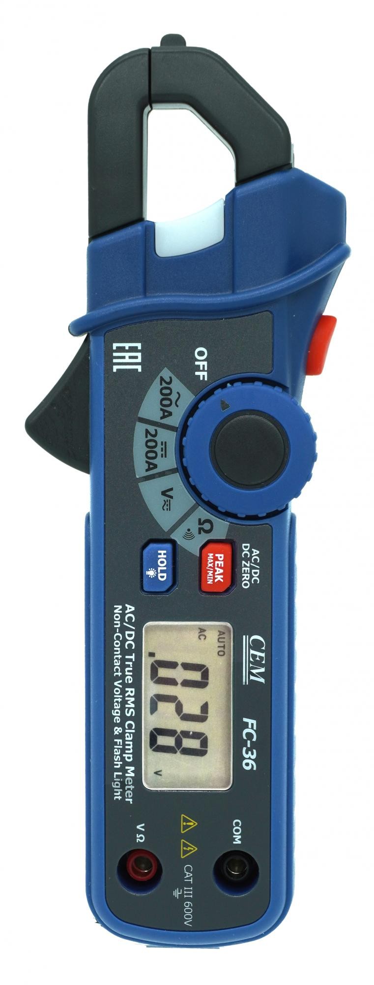 Компактные токовые клещи FC-36 предназначены для измерения постоянного и переменного тока до 200А. Также клещи имеют бесконтактный детектор напряжения и фонарик.