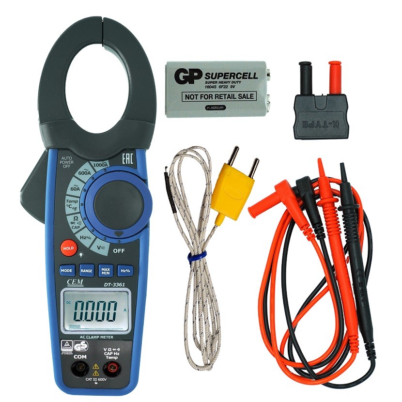 Профессиональные клещи серии 3361 измеряют переменный ток до 1000 А, напряжение, сопротивление, емкость, температуру, частоту. Высококонтрастный жидкокристаллический дисплей с подсветкой, цифровой и аналоговой шкалой.
