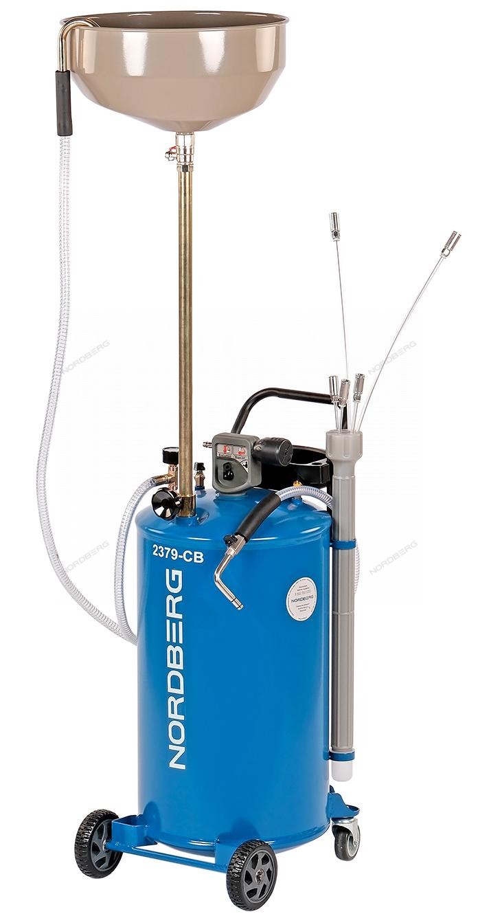 Установка для замены масла NORDBERG (2379-C) 2379-CB предназначена для удаления отработанного масла и других жидкостей из любого транспортного средства при помощи вентури-вакуумной вытяжной системы или свободным сливом.