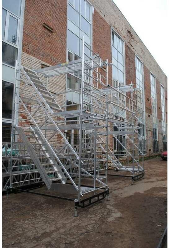 Легкий вес Комфортный подъем по наклонным лестничным маршам с широкими рифлеными ступенями Увеличенная рабочая площадка 1.4х2 м. Нагрузка на площадку 200 кг/м2 (560 кг на настил) Сборка без инструментов, замковое крепление элементов Консоли стабилизаторы для дополнительной устойчивости Поворотные колеса со стопорами Компенсация неровной опорной поверхности при помощи винтовых опор |
