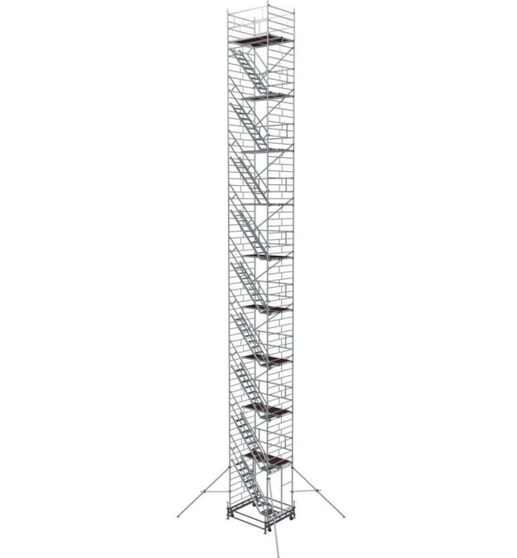 Легкий вес Комфортный подъем по наклонным лестничным маршам с широкими рифлеными ступенями Увеличенная рабочая площадка 1.4х2 м. Нагрузка на площадку 200 кг/м2 (560 кг на настил) Сборка без инструментов, замковое крепление элементов Консоли стабилизаторы для дополнительной устойчивости Поворотные колеса со стопорами Компенсация неровной опорной поверхности при помощи винтовых опор |