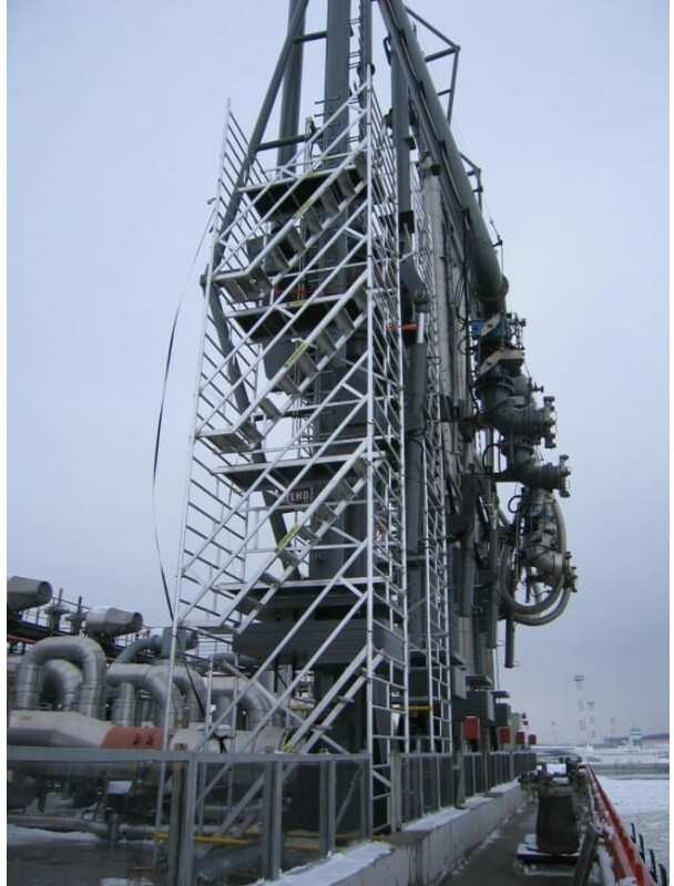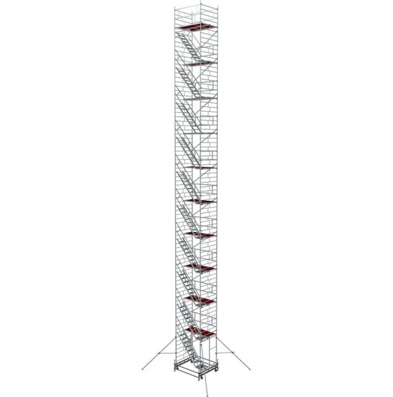 Легкий вес Комфортный подъем по наклонным лестничным маршам с широкими рифлеными ступенями Увеличенная рабочая площадка 1.4х2 м. Нагрузка на площадку 200 кг/м2 (560 кг на настил) Сборка без инструментов, замковое крепление элементов Консоли стабилизаторы для дополнительной устойчивости Поворотные колеса со стопорами Компенсация неровной опорной поверхности при помощи винтовых опор |