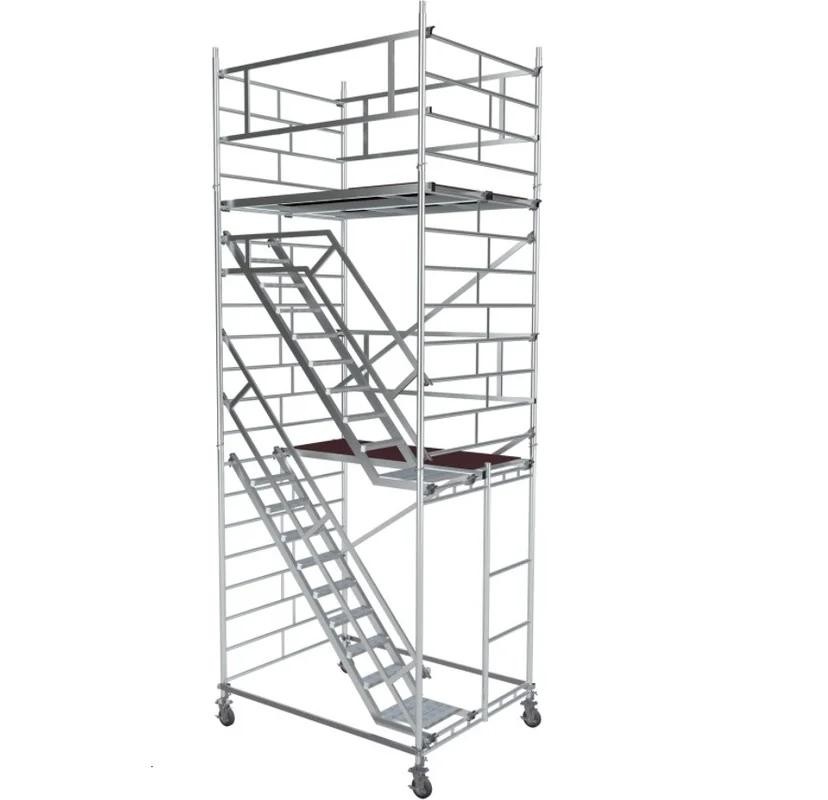 Легкий вес Комфортный подъем по наклонным лестничным маршам с широкими рифлеными ступенями Увеличенная рабочая площадка 1.4х2 м. Нагрузка на площадку 200 кг/м2 (560 кг на настил) Сборка без инструментов, замковое крепление элементов Консоли стабилизаторы для дополнительной устойчивости Поворотные колеса со стопорами Компенсация неровной опорной поверхности при помощи винтовых опор |