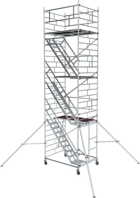 Легкий вес Комфортный подъем по наклонным лестничным маршам с широкими рифлеными ступенями Увеличенная рабочая площадка 1.4х2 м. Нагрузка на площадку 200 кг/м2 (560 кг на настил) Сборка без инструментов, замковое крепление элементов Консоли стабилизаторы для дополнительной устойчивости Поворотные колеса со стопорами Компенсация неровной опорной поверхности при помощи винтовых опор |