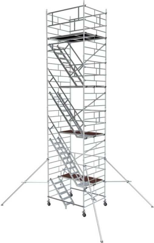 Легкий вес Комфортный подъем по наклонным лестничным маршам с широкими рифлеными ступенями Увеличенная рабочая площадка 1.4х2 м. Нагрузка на площадку 200 кг/м2 (560 кг на настил) Сборка без инструментов, замковое крепление элементов Консоли стабилизаторы для дополнительной устойчивости Поворотные колеса со стопорами Компенсация неровной опорной поверхности при помощи винтовых опор |