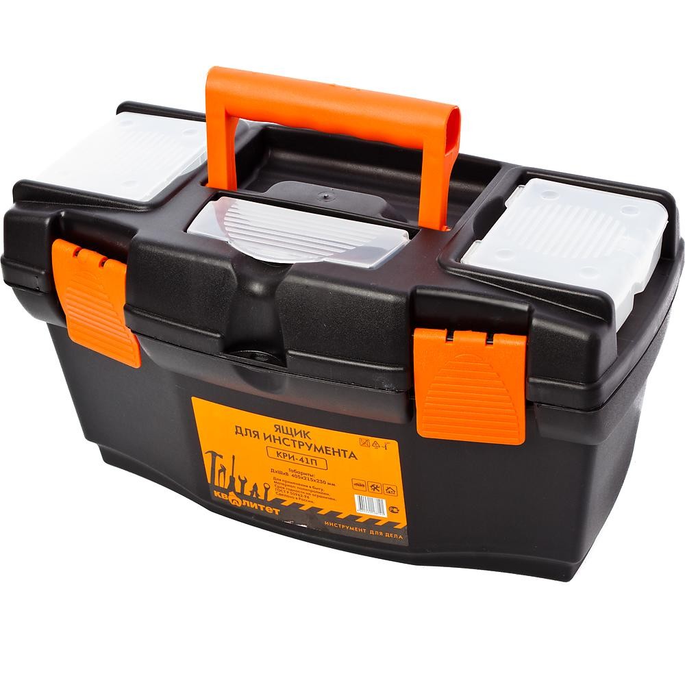 Ящик для инструмента Квалитет КРИ-41П — удобный способ хранения и переноски ручного инструмента. Прочный пластик корпуса устойчив к давящим и ударным нагрузками. Крышка запирается при помощи двух широких пластиковых петель. При необходимости крышку можно запирать небольшим навесным замком. У ящика есть встроенные отделения для хранения мелкой оснастки.