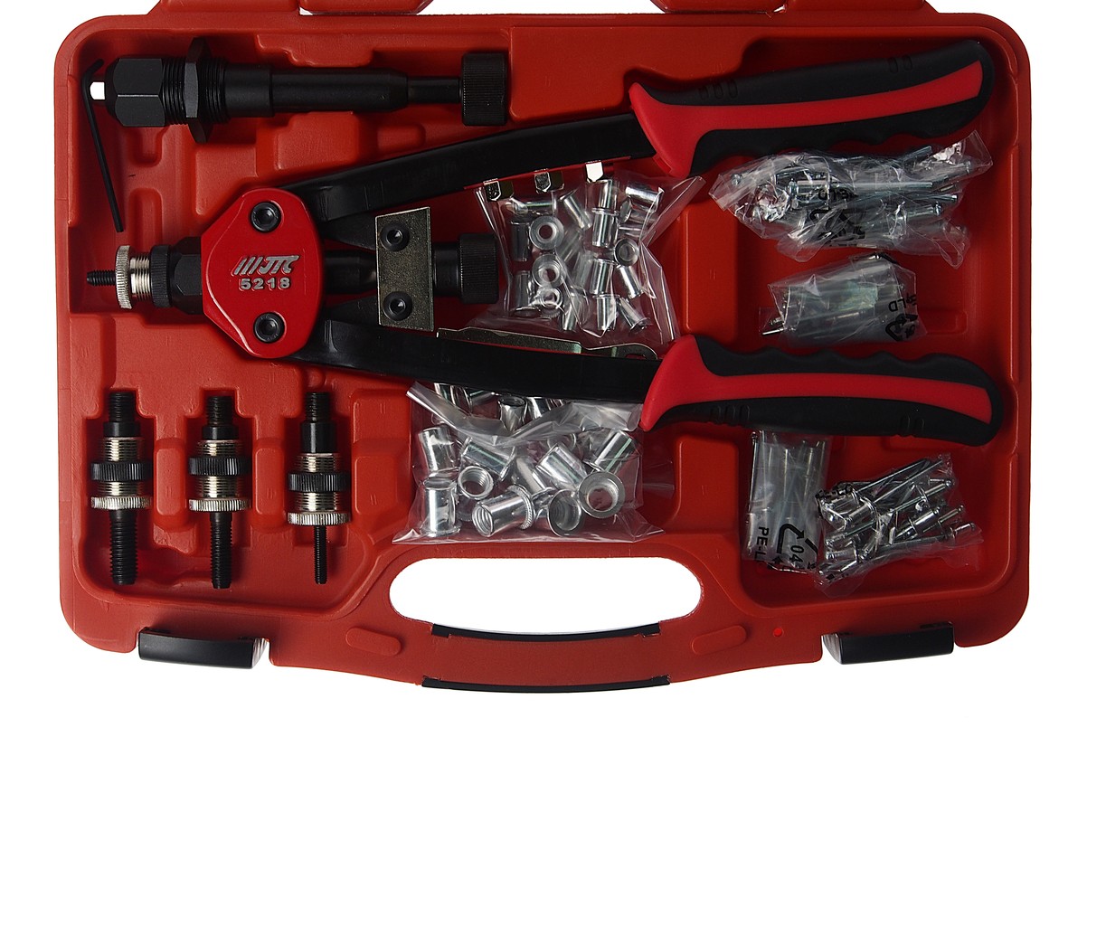 <div class="catalog-product-attributes__white-gradient"></div> Устройство двойного применения: как для гаек, так и для глухих заклепок. Требуется лишь заменить головку. Размер такой же как у JTC-5218. Общая длина: 325 мм. Производительность: заклепки: как у 5218. гайки: как у 5218N. В комплекте: заклепки: 20 шт/каждого размера (1/8", 5/32", 3/16", 1/4"). гайки: 10 шт/каждого размера (5, 6, 8, 10 мм). |