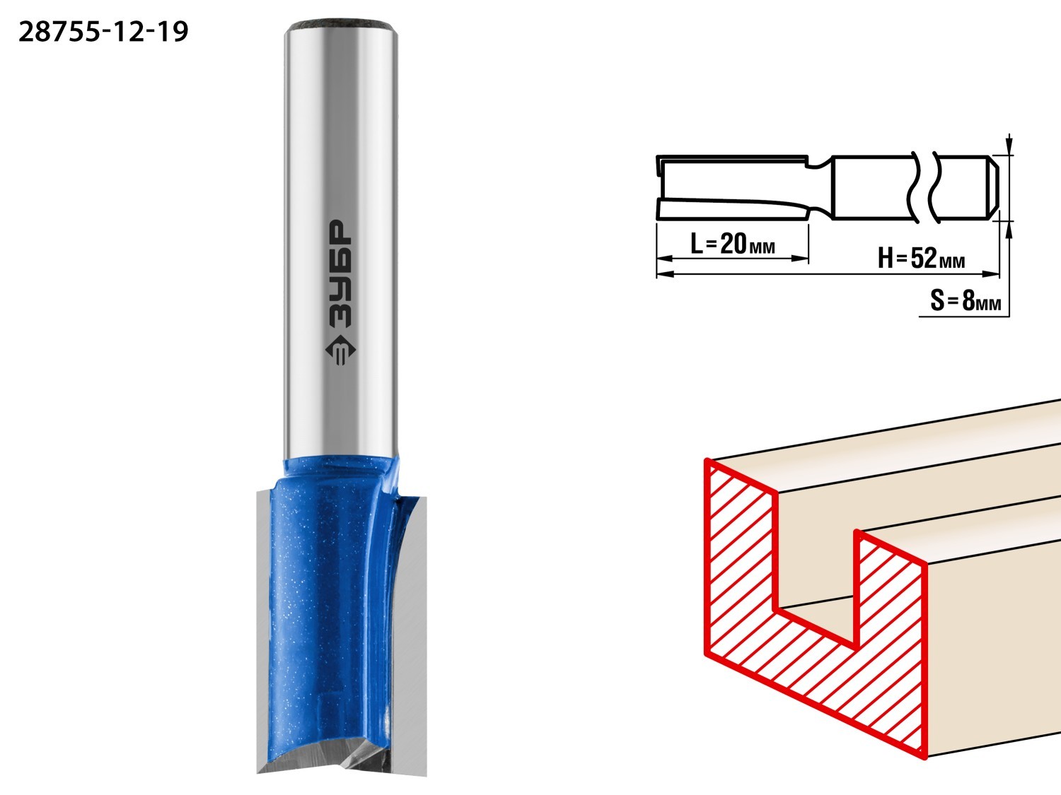ЗУБР 12 x 19 мм, хвостовик 8 мм, фреза пазовая прямая с нижними подрезателями, Профессионал (28755-12-19)