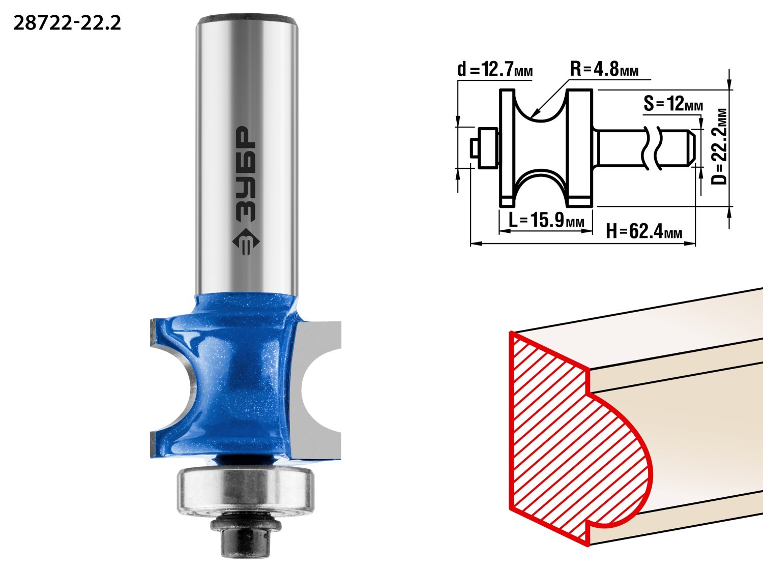 ЗУБР 22.2 x 25.4 мм, радиус 4.8 мм, фреза полустержневая с подшипником, Профессионал (28722-22.2)