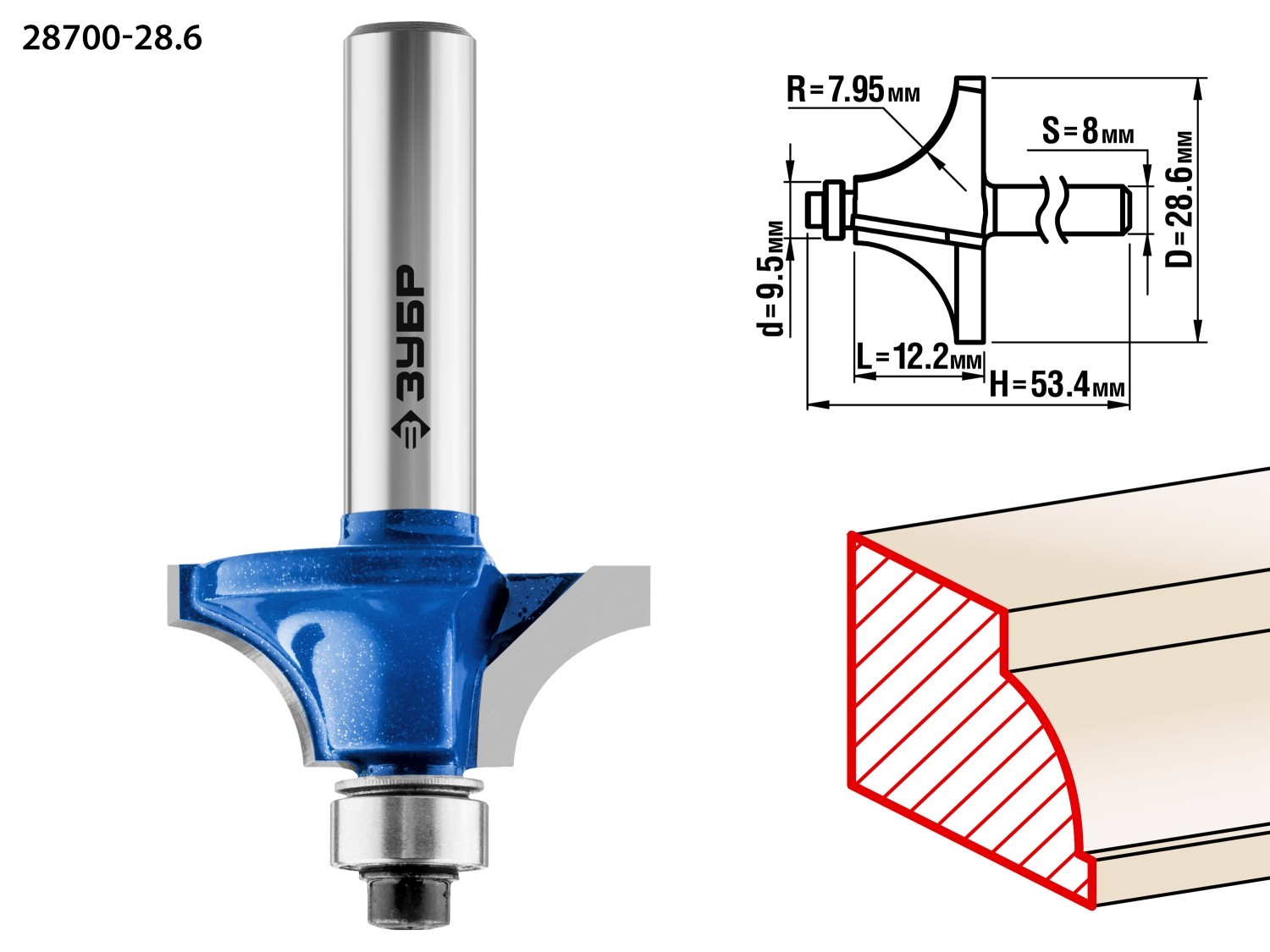ЗУБР 28.6 x 12.2 мм, радиус 8 мм, фреза кромочная калевочная №1, Профессионал (28700-28.6)
