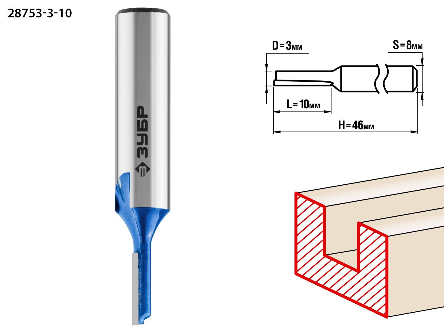 ЗУБР 3 x 10 мм, хвостовик 8 мм, фреза пазовая прямая, Профессионал (28753-3-10)