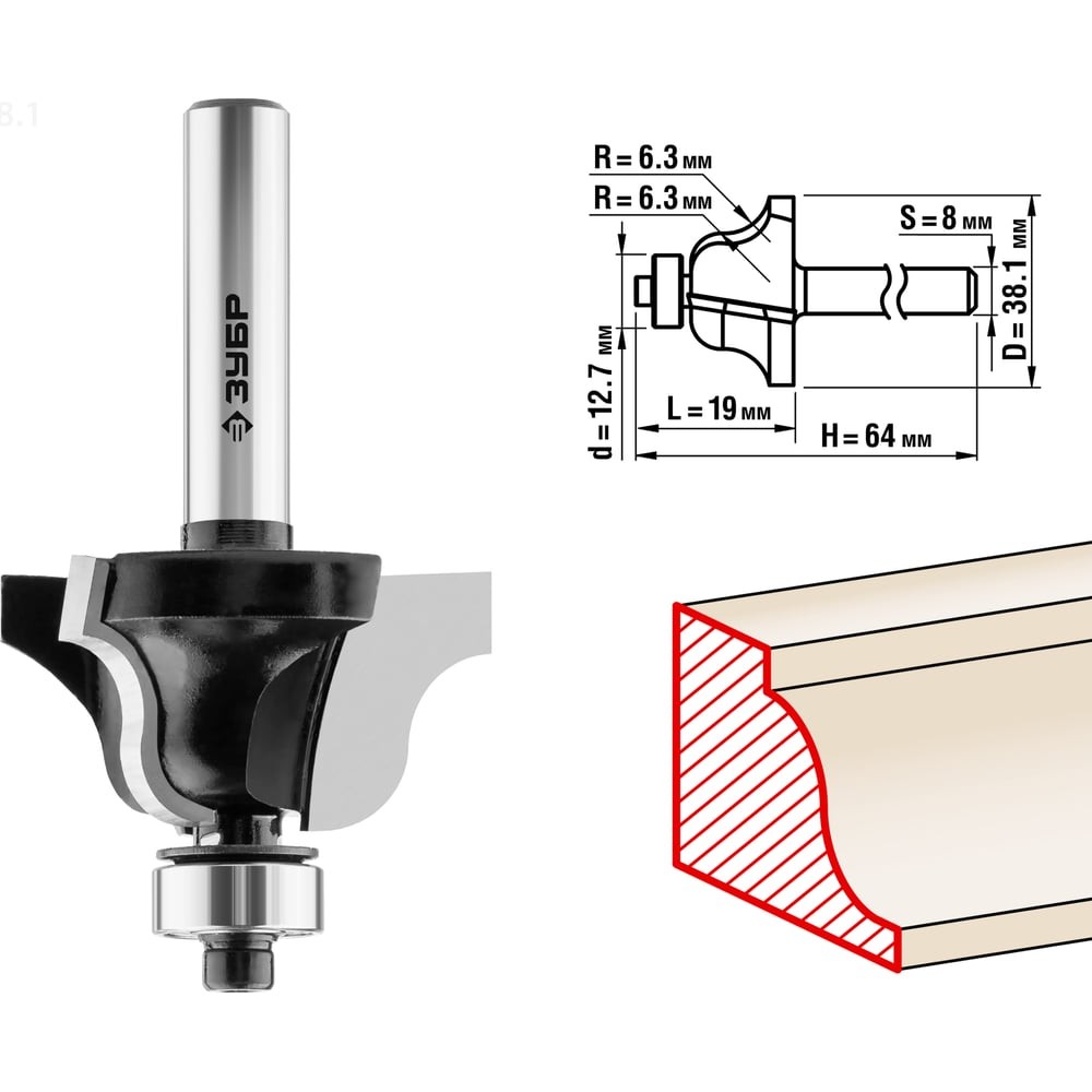 ЗУБР 38.1 x 19 мм, радиус 6.3 мм, фреза кромочная калевочная №4, Профессионал (28787-38.1)