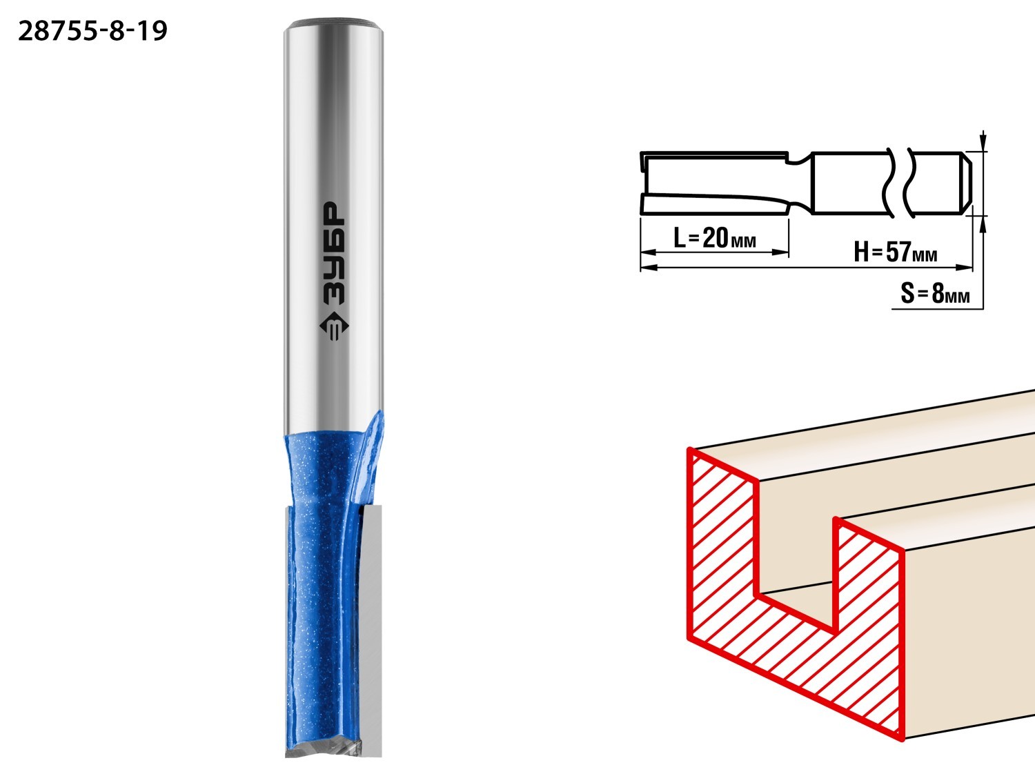 ЗУБР 8 x 19 мм, хвостовик 8 мм, фреза пазовая прямая с нижними подрезателями, Профессионал (28755-8-19)