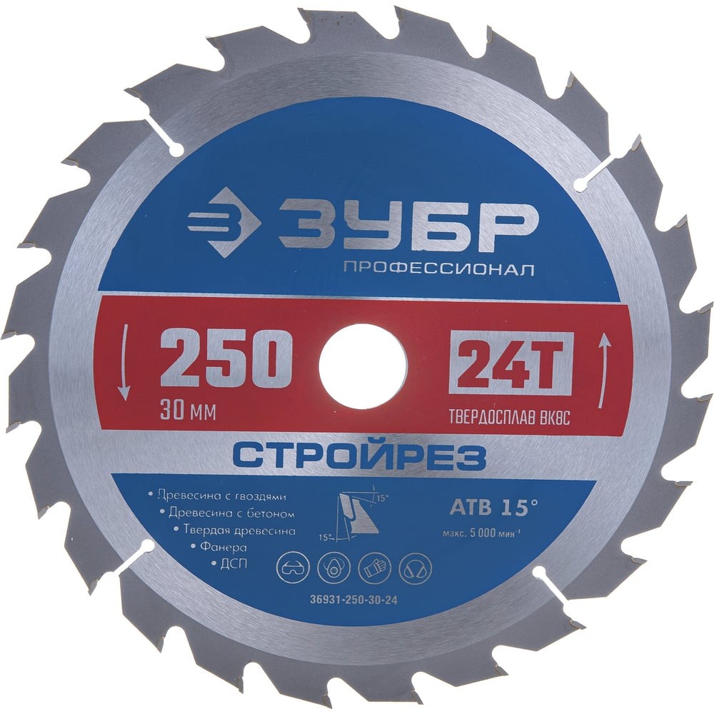 ЗУБР Стройрез, 250 х 30 мм, 24Т, пильный диск по строительной древесине, Профессионал (36931-250-30-24)